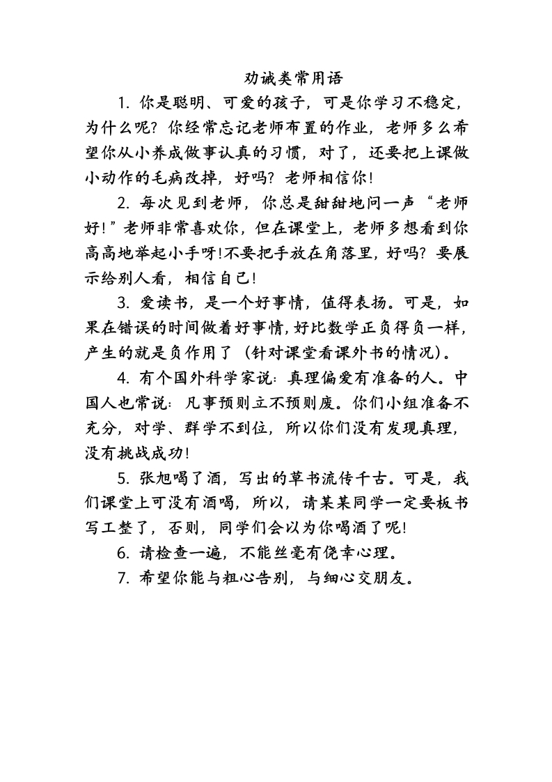 劝诫类常用语1.你是聪明、可爱的孩子,可是你学习不稳定,为什么呢?你经常忘记老师布置的作业,老师多么希望你从小养成做事认真的习惯,对了,还要把上课做小动作的毛病改掉,好吗?老师相信你!2.每次见到老师,你总是甜甜地问一声“老师好!”老师非常喜欢你,但在课堂上,老师多想看到你高高地举起小手呀!不要把手放在角落里,好吗?要展示给别人看,相信自己!3.爱读书,是一个好事情,值得表扬。可是,如果在错误的时间做着好事情,好比数学正负得负一样,产生的就是负作用了(针对课堂看课外书的情况)。4.有个国外科学家说:真理偏爱有准备的人。中国人也常说:凡事预则立不预则废。你们小组准备不充分,对学、群学不到位,所以你们没有发现真理,没有挑战成功!5.张旭喝了酒,写出的草书流传千古。可是,我们课堂上可没有酒喝,所以,请某某同学一定要板书写工整了,否则,同学们会以为你喝酒了呢!6.请检查一遍,不能丝毫有侥幸心理。7.希望你能与粗心告别,与细心交朋友。