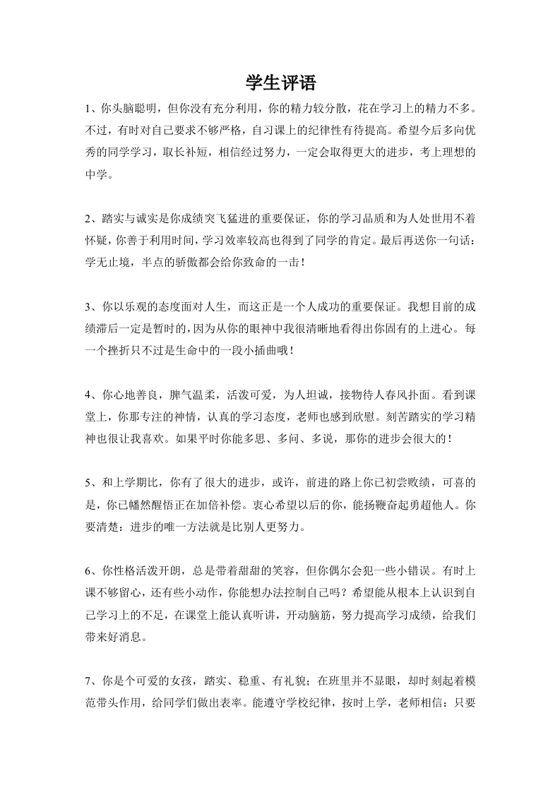 学生评语1、你头脑聪明,但你没有充分利用,你的精力较分散,花在学习上的精力不多。不过,有时对自己要求不够严格,自习课上的纪律性有待提高。希望今后多向优秀的同学学习,取长补短,相信经过努力,一定会取得更大的进步,考上理想的中学。2、踏实与诚实是你成绩突飞猛进的重要保证,你的学习品质和为人处世用不着怀疑,你善于利用时间,学习效率较高也得到了同学的肯定。最后再送你一句话:学无止境,半点的骄傲都会给你致命的一击!3、你以乐观的态度面对人生,而这正是一个人成功的重要保证。我想目前的成绩滞后一定是暂时的,因为从你的眼神中我很清晰地看得出你固有的上进心。每一个挫折只不过是生命中的一段小插曲哦!4、你心地善良,脾气温柔,活泼可爱,为人坦诚,接物待人春风扑面。看到课堂上,你那专注的神情,认真的学习态度,老师也感到欣慰。刻苦踏实的学习精神也很让我喜欢。如果平时你能多思、多问、多说,那你的进步会很大的!5、和上学期比,你有了很大的进步,或许,前进的路上你已初尝败绩,可喜的是,你已幡然醒悟正在加倍补偿。衷心希望以后的你,能扬鞭奋起勇超他人。你要清楚:进步的唯一方法就是比别人更努力。6、你性格活泼开朗,总是带着甜甜的笑容,但你偶尔会犯一些小错误。有时上课不够留心,还有些小动作,你能想办法控制自己吗?希望能从根本上认识到自己学习上的不足,在课堂上能认真听讲,开动脑筋,努力提高学习成绩,给我们带来好消息。7、你是个可爱的女孩,踏实、稳重、有礼貌:在班里并不显眼,却时刻起着模范带头作用,给同学们做出表率。能遵守学校纪律,按时上学,老师相信:只要
