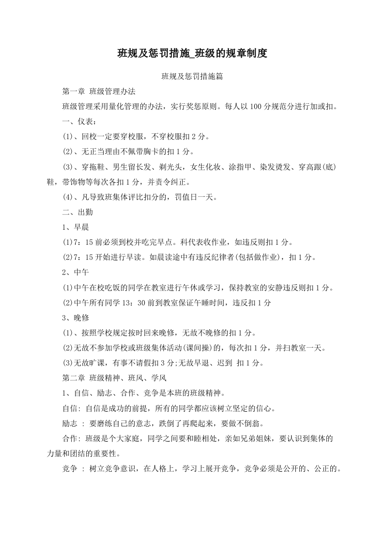 班规及惩罚措施班级的规章制度班规及惩罚措施篇第一章班级管理办法班级管理采用量化管理的办法,实行奖惩原则。每人以100分规范分进行加或扣。一、仪表:(1)、回校一定要穿校服,不穿校服扣2分。(2)、无正当理由不佩带胸卡的扣1分。(3)、穿拖鞋、男生留长发、剃光头,女生化妆、涂指甲、染发烫发、穿高跟(底)鞋,带饰物等每次各扣1分,并责令纠正。(4)、凡导致班集体评比扣分的,罚值日一天。二、出勤1、早晨(1)7:15前必须到校并吃完早点。科代表收作业,如违反则扣1分。(2)7:15开始进行早读。如晨读途中有违反纪律者(包括做作业),扣1分。2、中午(1)中午在校吃饭的同学在教室进行午休或学习,保持教室的安静违反则扣1分。(2)中午所有同学13:30前到教室保证午睡时间,违反扣1分3、晚修(1)、按照学校规定按时回来晚修,无故不晚修的扣1分。(2)无故不参加学校或班级集体活动(课间操)的,每次扣1分,并扫教室一天。(3)无故旷课,有事不请假扣3分:无故早退、迟到扣1分。第二章班级精神、班风、学风1、自信、励志、合作、竞争是本班的班级精神。自信:自信是成功的前提,所有的同学都应该树立坚定的信心。励志:要磨练自己的意志,跌倒了再爬起来,要做不倒翁。合作:班级是个大家庭,同学之间要和睦相处,亲如兄弟姐妹,要认识到集体的力量和团结的重要性。竞争:树立竞争意识,在人格上,学习上展开竞争,竞争必须是公开的、公正的。