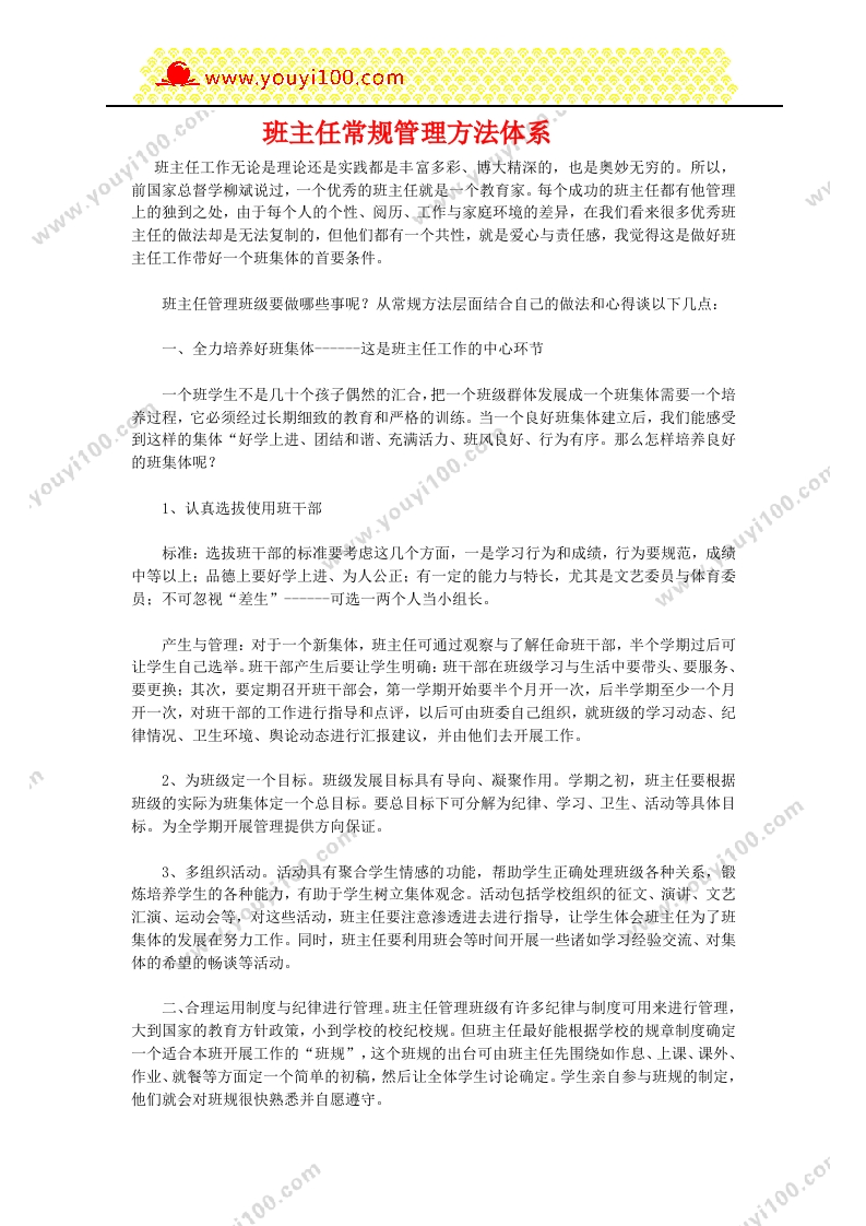 www.youyi100.com班主任常规管理方法体系筋主在工作无论生石件东前国家总督学柳斌说过,一个优秀的班主任就是一个教育家。每个成功的班主任都有他管理上的独到之处,由于每个人的个性、阅历、工作与家庭环境的差异,在我们看来很多优秀班主任的做法却是无法复制的,但他们都有一个共性,就是爱心与责任感,我觉得这是做好班主任工作带好一个班集体的首要条件。班主任管理班级要做哪些事呢?从常规方法层面结合自己的做法和心得谈以下几点:一、全力培养好班集体一一这是班主任工作的中心环节一个班学生不是几十个孩子偶然的汇合,把一个班级群体发展成一个班集体需要一个培养过程,它必须经过长期细致的教育和严格的训练。当一个良好班集体建立后,我们能感受类旅。守子产上进、团打结和谐、充两活力、班风良好、行为有字。那之短踏的班集体呢?1、认真选拔使用班干部w.youyi100.c超儿个中等以上:品德上要好学上进、为人公正:有一定的能力与特长,尤其是文艺委员与体育委员:不可忽视“差生”一一可选一两个人当小组长。W产生与管理:对于一个新集体,班主任可通过观察与了解任命班干部,半个学期过后可让学生自己选举。班干部产生后要让学生明确:班干部在班级学习与生活中要带头、要服务、要更换:其次,要定期召开班干部会,第一学期开始要半个月开一次,后半学期至少一个月开一次,对班干部的工作进行指导和点评,以后可由班委自己组织,就班级的学习动态、纪律情况、卫生环境、舆论动态进行汇报建议,并由他们去开展工作。n2、为班级定一个目标。班级发展目标具有导向、凝聚作用。学期之初,班主任要根据班级的实际为班集体定一个总目标。要总目标下可分解为纪律、学习、卫生、活动等具体目标。为全学期开展管理提供方向保证。0100.c0m3、多组织活动。活动具有聚合学生情感的功能,帮助学生正确处理班级各种关系,炼培养学生的各种能力,有助于学生树立集体观念。活动包括学校组织的征文、演讲、文艺汇演、运动会等,对这些活动,班主任要注意渗透进去进行指导,让学生体会班主任为了班集体的发展在努力工作。同时,班主任要利用班会等时间开展一些诸如学习经验交流、对集体的希望的畅谈等活动。二、合理运用制度与纪律进行管理。班主任管理班级有许多纪律与制度可用来进行管理,大到国家的教育方针政策,小到学校的校纪校规。但班主任最好能根据学校的规章制度确定一个适合本班开展工作的“班规”,这个班规的出台可由班主任先围绕如作息、上课、课外、作业、就餐等方面定一个简单的初稿,然后让全体学生讨论确定。学生亲自参与班规的制定,他们就会对班规很快熟悉并自愿遵守。100.c0mvi100.cor