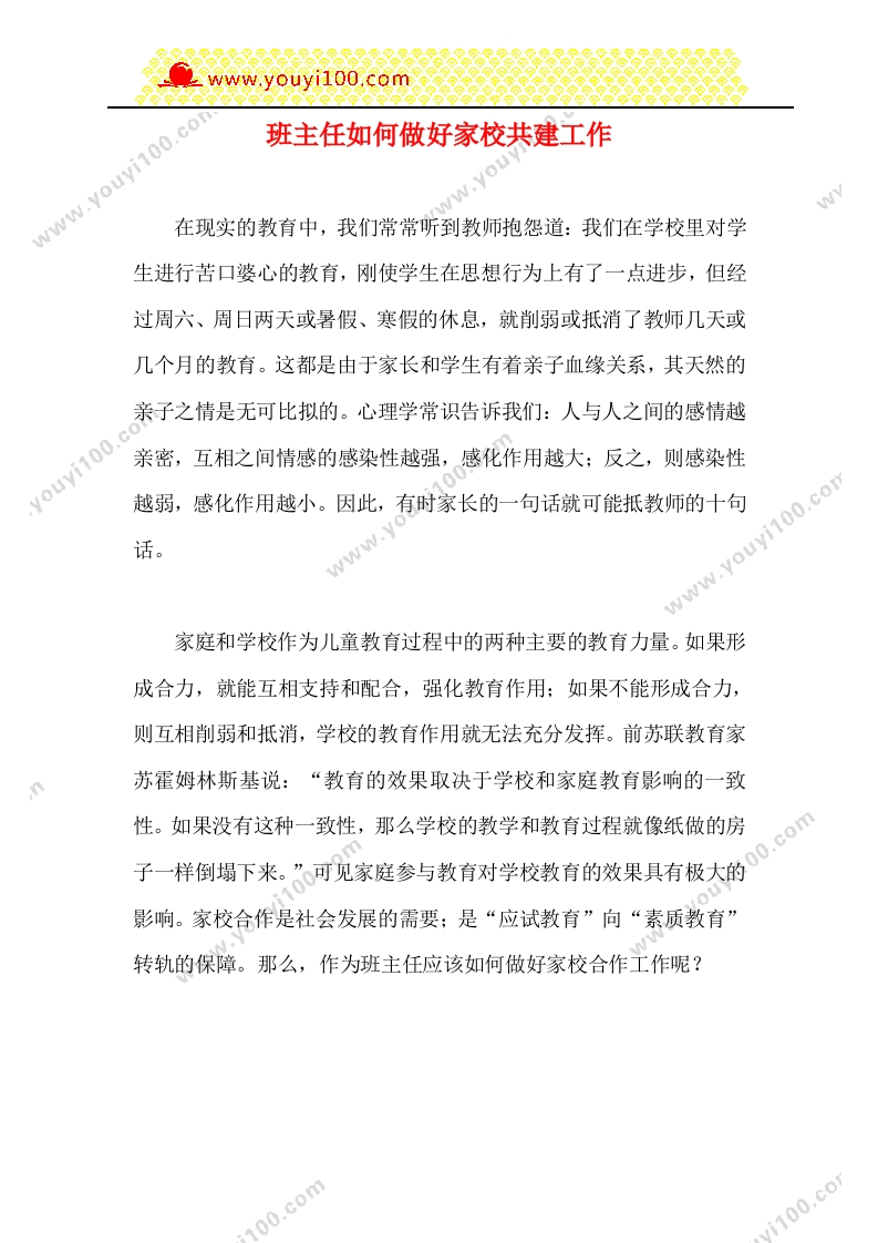 www.youyi100.comwww.youyi100.com班主任如何做好家校共建工作VW.在现实的教育中,我们常常听到教师抱怨道:我们在学校里对学生进行苦口婆心的教育,刚使学生在思想行为上有了一点进步,但经过周六、周日两天或暑假、寒假的休息,就削弱或抵消了教师几天或几个月的教育。这都是由于家长和学生有着亲子血缘关系,其天然的子之情是无可比拟的。心理学常识告诉我们:人与人之间的感情越youyi100.co亲密,互相之间情感的感染性越强,感化作用越大;反之,则感染性越弱,感化作用越小。因此,有时家长的一句话就可能抵教师的十句话。www.ywww.youyi100.com家庭和学校作为儿童教育过程中的两种主要的教育力量。如果形成合力,就能互相支持和配合,强化教育作用:如果不能形成合力,则互相削弱和抵消,学校的教育作用就无法充分发挥。前苏联教育家n苏霍姆林斯基说:“教育的效果取决于学校和家庭教育影响的一致性。如果没有这种一致性,那么学校的教学和教育过程就像纸做的房子一样倒塌下来,”可见家庭参与教有对学校教有的效果具有极大的。0影响。家校合作是社会发展的需要;是“应试教育”向“素质教育”转轨的保障。那么,作为班主任应该如何做好家校合作工作呢?100.c0myi100.c0