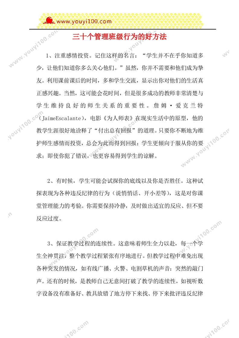 www.youyi100.comwww.youyi100.cor三十个管理班级行为的好方法1、注重感情投资。记住这样的名言:“学生并不在乎你知道多少,让他们知道你多么关心他们。”虽然,你并不需要和他们成为挚友。利用课前课后的时间,多和学生交流,显示出你对他们的生活真正感兴趣。当然,这可能会花时间,但是很多成功的教师非常清楚与学生维持良好的师生关系的重要性。詹姆·爱克兰特产moEscalanto),电形《为人师表》在现实生活中的原型,他的www.youyi100.com教学生涯很好地诠释了“付出总有回报”的道理。只要你不断地为维护师生感情而投资,总会为此而得到回报:学生更倾向于服从你的要求;即使你犯了错误,也更容易得到学生的谅解。2、有时候,学生可能会试探你的底线以及你是否胜任。这种试探表现为各种违反纪律的行为(说悄悄话、开小差等),这是对你课堂管理能力的考验。你需要保持冷静,及时做出适宜的反应、但不要n反应过度。comi100.c0m3、保证教学过程的连续性。这意味着师生全力以赴,每个生全神贯注,整个教学过程紧张有序地进行。但教学过程中难免出现各种突发的情况,如有线广播、火警、电割草机的声音:突然的敲门声。还有的时候,是教师自己无意间打破了教学的连续性,如视听数字设备没有准备好、教具放错了地方停下来找、停下来批评违反纪律900.c0myi100.c0