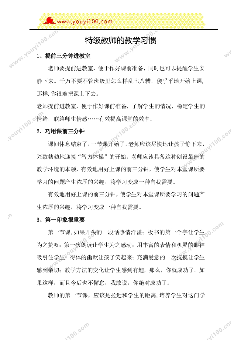 www.youyi100.comwww.youyi100.con特级教师的教学习惯1、提前三分钟进教室W.老师要提前进教室,便于作好课前准备,同时也可以提醒学生安静下来。千万不要不管班级里怎么样乱七八糟,傻乎乎地开始上课,那样,你很难把课上下去。老师提前进教室,便于作好课前准备,了解学生的情况,稳定学生的010心情绪,联络师生情感…有效提高课堂的效率。2、巧用课前三分钟iyi100.co课间休息结束了,一节课开始了,老师应该尽快地让孩子静下来,yi100.com兴致勃勃地迎接“智力体操”的开始。老师应该具备这种创设最佳的教学环境的本领,有效地用好上课的前三分钟,使学生对本堂课所要学习的问题产生浓厚的兴趣,将学习变成一种自我需要。有效地用好上课的前三分钟,使学生对本堂课所要学习的问题产生浓厚的兴趣,将学习变成一种自我需要。n3、第一印象很重要果开头的一段话热情洋溢;板书的算、为之赞叹;第一次朗读让学生为之感动:用丰富的表情和机灵的眼神吸引住学生:得体的幽默让孩子笑起来:充满爱意的一次抚摸让学生感到亲切:教学方法的变化让学生感到有趣,那么,你就成功了。如果这样,而且今后也不懈怠,我敢说,你绝对成功了。教师的第一节课,应该是拉近和学生的距离,培养学生对这门学100.c0mvi100.cor