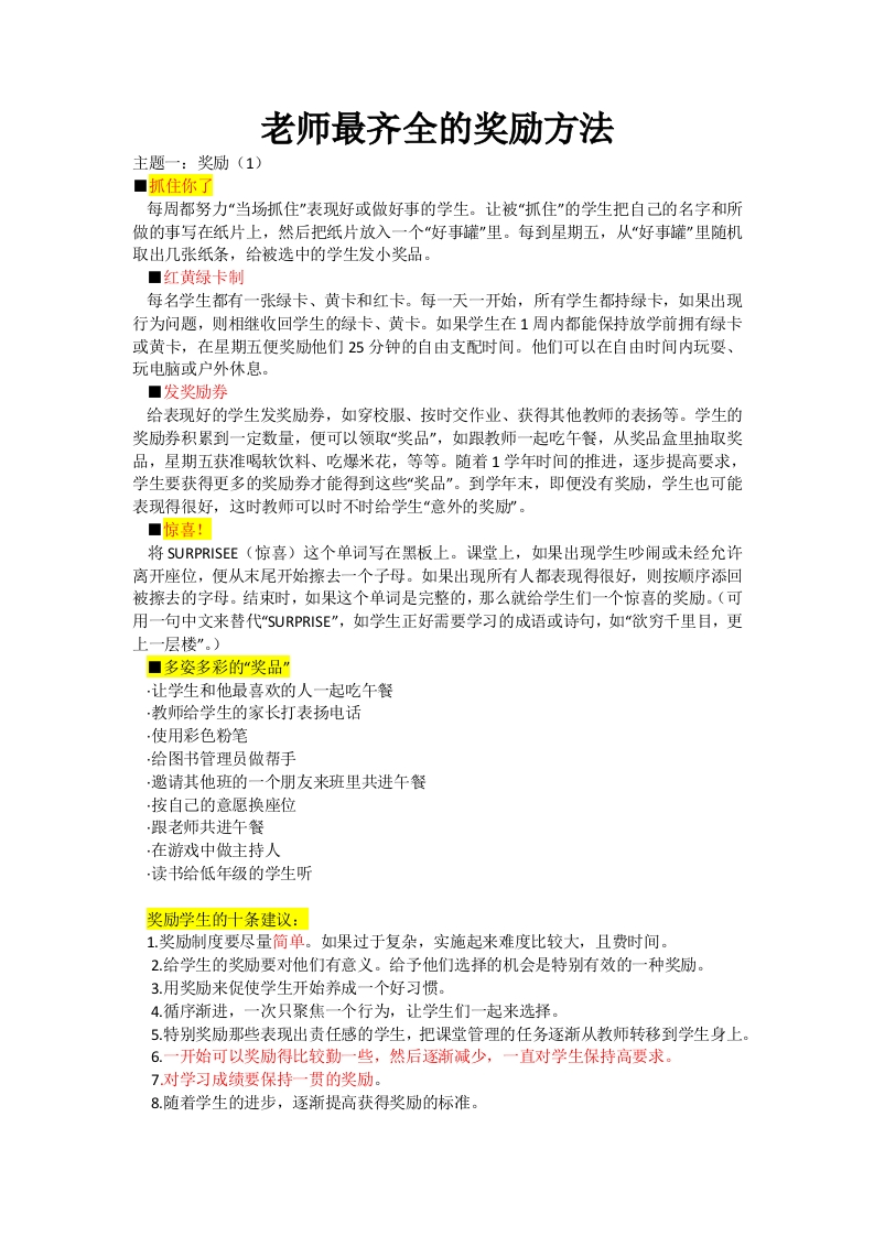 老师最齐全的奖励方法主题一:奖励(1)■抓住你了每周都努力“当场抓住”表现好或做好事的学生。让被“抓住”的学生把自己的名字和所做的事写在纸片上,然后把纸片放入一个“好事罐”里。每到星期五,从“好事罐”里随机取出几张纸条,给被选中的学生发小奖品■红黄绿卡制每名学生都有一张绿卡、黄卡和红卡。每一天一开始,所有学生都持绿卡,如果出现行为问题,则相继收回学生的绿卡、黄卡。如果学生在1周内都能保持放学前拥有绿卡或黄卡,在星期五便奖励他们25分钟的自由支配时间。他们可以在自由时间内玩耍、玩电脑或户外休息。■发奖励券给表现好的学生发奖励券,如穿校服、按时交作业、获得其他教师的表扬等。学生的奖励券积累到一定数量,便可以领取“奖品”,如跟教师一起吃午餐,从奖品盒里抽取奖品,星期五获准喝软饮料、吃爆米花,等等。随着1学年时间的推进,逐步提高要求,学生要获得更多的奖励券才能得到这些“奖品”。到学年末,即便没有奖励,学生也可能表现得很好,这时教师可以时不时给学生“意外的奖励”。■惊喜!将SURPRISEE(惊喜)这个单词写在黑板上。课堂上,如果出现学生吵闹或未经允许离开座位,便从末尾开始擦去一个子母。如果出现所有人都表现得很好,则按顺序添回被擦去的字母。结束时,如果这个单词是完整的,那么就给学生们一个惊喜的奖励。(可用一句中文来替代“SURPRISE”,如学生正好需要学习的成语或诗句,如“欲穷千里目,更上一层楼”。)■多姿多彩的“奖品”·让学生和他最喜欢的人一起吃午餐教师给学生的家长打表扬电话使用彩色粉笔,给图书管理员做帮手,邀请其他班的一个朋友来班里共进午餐,按自己的意愿换座位,跟老师共进午餐·在游戏中做主持人读书给低年级的学生听奖励学生的十条建议:1.奖励筛制度要尽量简单。如果过于复杂,实施起来难度比较大,且费时间。2.给学生的奖励要对他们有意义。给予他们选择的机会是特别有效的一种奖励。3.用奖励来促使学生开始养成一个好习惯。4循序渐进,一次只聚焦一个行为,让学生们一起来选择。5.特别奖励那些表现出责任感的学生,把课堂管理的任务逐渐从教师转移到学生身上。6.一开始可以奖励得比较勤一些,然后逐渐减少,一直对学生保持高要求。7对学习成绩要保持一贯的奖励。8随着学生的进步,逐渐提高获得奖励的标准。