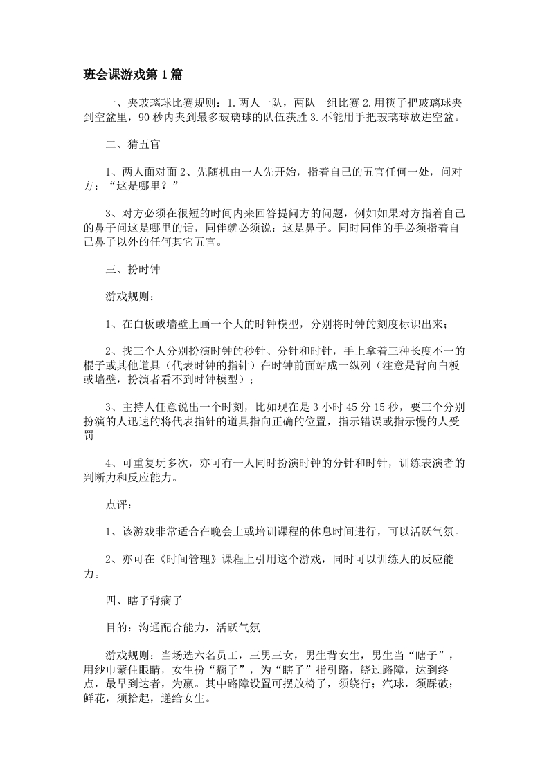 班会课游戏第1篇一、夹玻璃球比赛规则:1.两人一队,两队一组比赛2.用筷子把玻璃球夹到空盆里,90秒内夹到最多玻璃球的队伍获胜3.不能用手把玻璃球放进空盆。二、猜五官1、两人面对面2、先随机由一人先开始,指着自己的五官任何一处,问对方:“这是哪里?”3、对方必须在很短的时间内来回答提问方的问题,例如如果对方指着自己的鼻子问这是哪里的话,同伴就必须说:这是鼻子。同时同伴的手必须指着自己鼻子以外的任何其它五官。三、扮时钟游戏规则:1、在白板或墙壁上画一个大的时钟模型,分别将时钟的刻度标识出来:2、找三个人分别扮演时钟的秒针、分针和时针,手上拿着三种长度不一的棍子或其他道具(代表时钟的指针)在时钟前面站成一纵列(注意是背向白板或墙壁,扮演者看不到时钟模型):3、主持人任意说出一个时刻,比如现在是3小时45分15秒,要三个分别扮演的人迅速的将代表指针的道具指向正确的位置,指示错误或指示慢的人受罚4、可重复玩多次,亦可有一人同时扮演时钟的分针和时针,训练表演者的判断力和反应能力。点评:1、该游戏非常适合在晚会上或培训课程的休息时间进行,可以活跃气氛。2、亦可在《时间管理》课程上引用这个游戏,同时可以训练人的反应能力。四、瞎子背瘸子目的:沟通配合能力,活跃气氛游戏规则:当场选六名员工,三男三女,男生背女生,男生当“瞎子”,用纱巾蒙住眼睛,女生扮“瘸子”,为“瞎子”指引路,绕过路障,达到终点,最早到达者,为赢。其中路障设置可摆放椅子,须绕行:汽球,须踩破:鲜花,须拾起,递给女生。