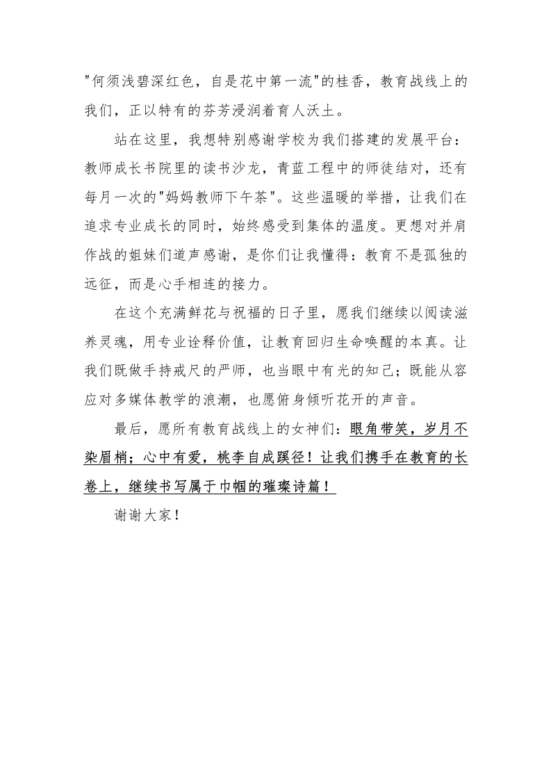 春风化雨绽芳华巾帼执笔写春秋一三八妇女节女教师代表发言稿尊敬的校领导、亲爱的姐妹们:大家节日好!此刻捧着这杯暖茶,望着台下熟悉的面庞,我的眼眶有些湿润。作为从教十五年的语文老师,此刻却觉得任何华丽的辞藻都难以形容这份感动一一能作为女教师代表,在这个属于我们的节日里,与朝夕相处的姐妹们共话教育人生,是荣耀更是幸福。清晨六点离家时孩子熟睡的脸庞,深夜十点办公室亮着的台灯,运动会上为学生呐喊到沙哑的嗓音,家长会上被汗水浸湿的衬衫后背…这些场景,在座的每位姐妹都曾经历过。我们既是母亲、妻子、女儿,更是三尺讲台的守望者。当粉笔灰染白鬓角,当教案本堆满案头,我们却始终相信:那些在课堂上点燃的思想火花,那些被悄悄塞进作业本里的暖心纸条,那些毕业多年仍寄来的教师节问候,就是岁月赠予教育者最美的勋章。记得去年流感季,李老师挂着吊瓶在走廊批改作业的身影:难忘张主任产假未休完就回到岗位,抱着教案穿梭教室的坚定步伐;更感动于青年教师小王在朋友圈写下“今天又解锁了单手抱娃备课新技能”时的乐观。我们不是超人,却用柔韧与智慧书写着当代教育女性的担当。正如李清照笔下