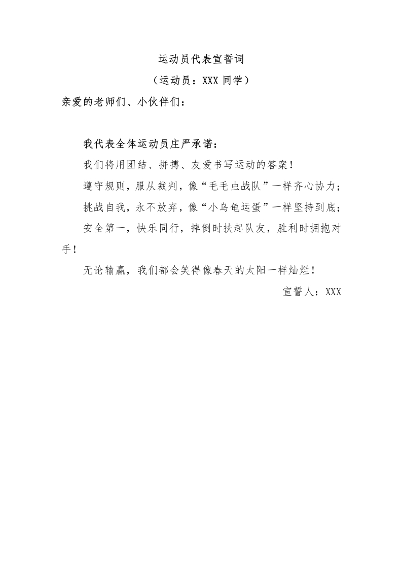 小学2025年春季趣味运动会裁判代表、运动员代表宣誓词裁判代表宣誓词(裁判员:XX老师)尊敬的各位领导、老师、家长,亲爱的同学们:我代表全体裁判员郑重宣誓:我们将以公平、公正、公开的态度,认真履行裁判职责!严格遵守比赛规则,尊重每一份努力,绝不偏袒任何选手;细心检查器材安全,守护赛场秩序,为你们的快乐保驾护航;用微笑鼓励勇气,用掌声致敬坚持,让汗水与欢笑共同闪光!请同学们放心拼搏,请家长们安心见证!宣誓人:XXX