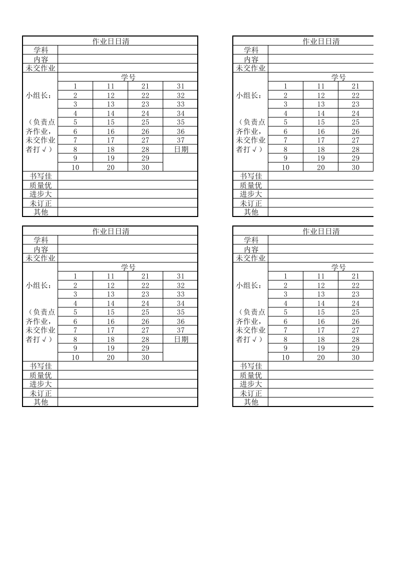 作业日日清作业日日清学科学科内容内容未交作业未交作业学号学号111213111121小组长:2122232小组长:21222313233331323414243441424(负责点5152535(负责点51525齐作业,6162636齐作业,61626未交作业7172737未交作业71727者打√)81828日期者打√)818289192991929102030102030书写佳书写佳质量优质量优进步大进步大未订正未订正其他其他作业日日清作业日日清学科学科内容内容未交作业未交作业学号学号111213111121小组长:2122232小组长:21222313233331323414243441424(负责点5152535(负责点51525齐作业,6162636齐作业,61626未交作业7172737未交作业71727者打√)81828日期者打√)818289192991929102030102030书写佳书写佳质量优质量优进步大进步大未订正未订正其他其他
