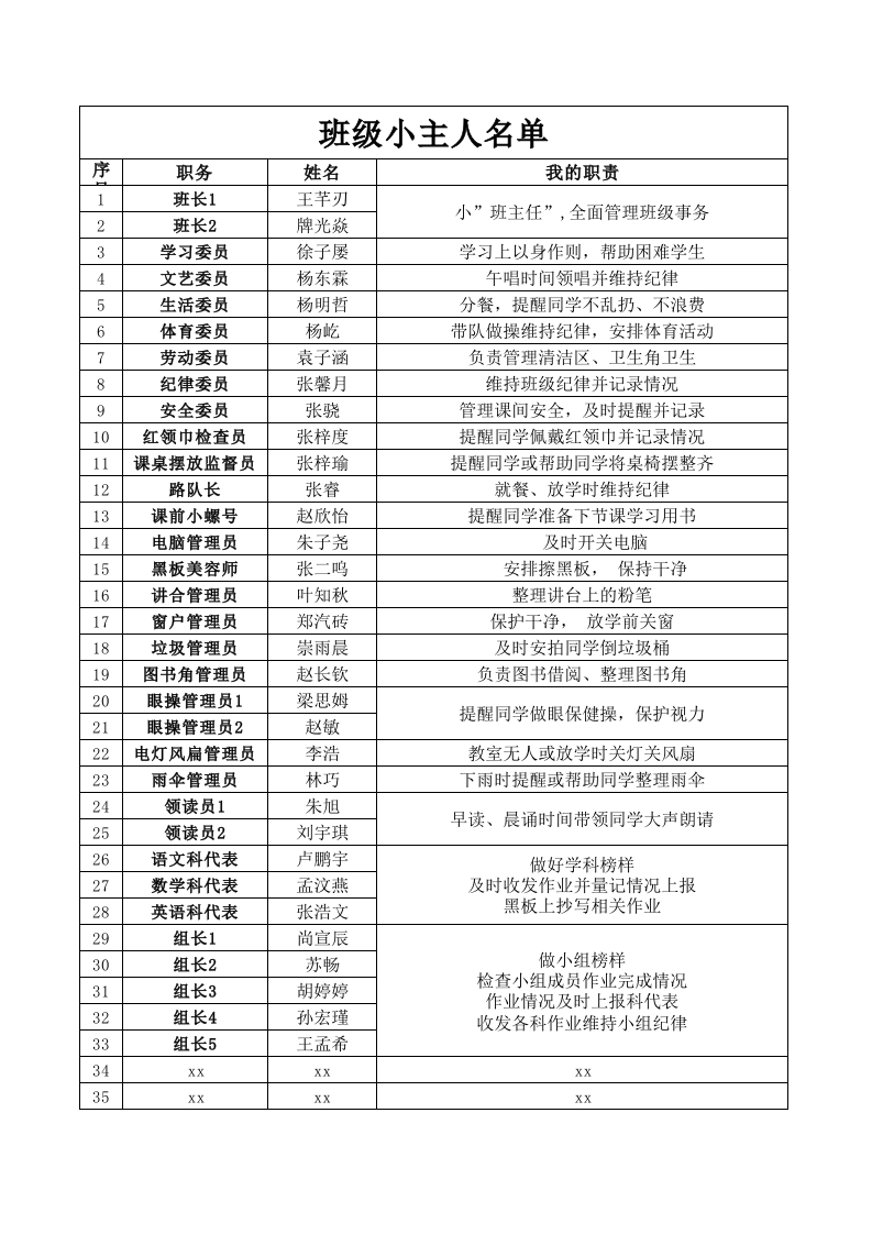 班级小主人名单摩职务姓名我的职责1班长1王芊刃小”班主任”,全面管理班级事务2班长2牌光焱3学习委员徐子屡学习上以身作则,帮助困难学生4文艺委员杨东霖午唱时间领唱并维持纪律5生活委员杨明哲分餐,提醒同学不乱扔、不浪费6体育委员杨屹带队做操维持纪律,安排体育活动7劳动委员袁子涵负责管理清洁区、卫生角卫生8纪律委员张馨月维持班级纪律并记录情况9安全委员张骁管理课间安全,及时提醒并记录10红领巾检查员张梓度提醒同学佩戴红领巾并记录情况11课桌摆放监督员张梓瑜提醒同学或帮助同学将桌椅摆整齐12路队长张睿就餐、放学时维持纪律13课前小螺号赵欣怡提醒同学准备下节课学习用书14电脑管理员朱子尧及时开关电脑15黑板美容师张二鸣安排擦黑板,保持干净16讲合管理员叶知秋整理讲台上的粉笔17窗户管理员郑汽砖保护干净,放学前关窗18垃圾管理员崇雨晨及时安拍同学倒垃圾桶19图书角管理员赵长钦负责图书借阅、整理图书角20眼操管理员1梁思姆提醒同学做眼保健操,保护视力21眼操管理员2赵敏22电灯风扁管理员李浩教室无人或放学时关灯关风扇23雨伞管理员林巧下雨时提醒或帮助同学整理雨伞24领读员1朱旭早读、晨诵时间带领同学大声朗请25领读员2刘宇琪26语文科代表卢鹏宇做好学科榜样27数学科代表孟汶燕及时收发作业并量记情况上报28英语科代表张浩文黑板上抄写相关作业29组长1尚宣辰30组长2苏畅做小组榜样31组长3胡婷婷检查小组成员作业完成情况作业情况及时上报科代表32组长4孙宏瑾收发各科作业维持小组纪律33组长5王孟希34XXXXXX35XXXXXX