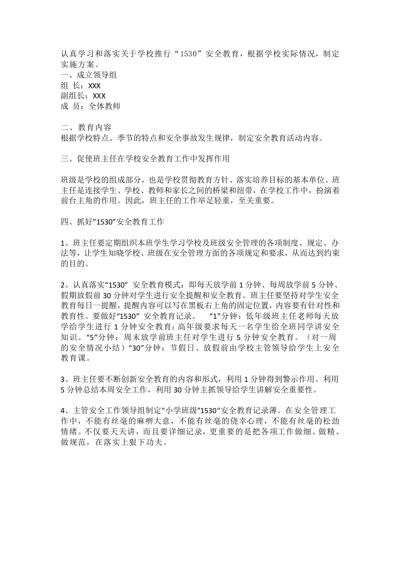 认真学习和落实关于学校推行“1530”安全教育,根据学校实际情况,制定实施方案。一、成立领导组组长:XX副组长:XX成员:全体教师二、教育内容根据学校特点、季节的特点和安全事故发生规律,制定安全教育活动内容。三、促使班主任在学校安全教育工作中发挥作用班级是学校的组成部分,也是学校贯彻教育方针、落实培养目标的基本单位。班主任是连接学生、学校、教师和家长之间的桥梁和纽带,在学校工作中,扮演着前台主角的作用。因此,班主任的工作举足轻重,至关重要。四、抓好"1530安全教育工作1、班主任要定期组织本班学生学习学校及班级安全管理的各项制度、规定、办法等,让学生知晓学校、班级在安全管理方面的各项规定和要求,从而达到约束的目的。2、认真落实“1530安全教育模式:即每天放学前1分钟、每周放学前5分钟、假期放假前30分钟对学生进行安全提醒和安全教育。班主任要坚持对学生安全教育每日一提醒,提醒内容可以写在黑板右上角的固定位置,内容要有针对性和教育性。要做好“1530”安全教育记录。“1”分钟:低年级班主任老师每天放学给学生进行1分钟安全教育:高年级要求每天一名学生给全班同学讲安全知识。“5”分钟:周末放学前班主任对学生进行5分钟安全教育。(对一周的安全情况小结)“30”分钟:节假日、放假前由学校主管领导给学生上安全教育课。3、班主任要不断创新安全教育的内容和形式,利用1分钟得到警示作用。利用5分钟总结本周安全工作,利用30分钟主抓领导给学生讲解安全重要性。4、主管安全工作领导组制定“小学班级”1530“安全教育记录薄。在安全管理工作中,不能有丝毫的麻痹大意,不能有丝毫的侥幸心理,不能有丝毫的松劲情绪。不仅要天天讲,而且要详细记录,更重要的是把各项工作做细、做精做规范,在落实上狠下功夫。