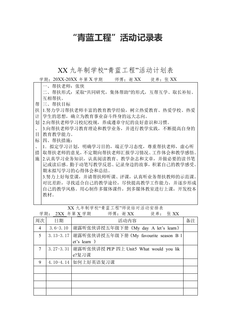 “青蓝工程”活动记录表XX九年制学校“青蓝工程”活动计划表学期:20XX-20XX年第X学期师傅:谢XX徒弟:张XX一、帮扶老师:张侠二、帮扶形式:采取“共同研究,集体帮助的形式,互帮互学、取长补短、互相帮扶。帮三、帮扶目标扶1.努力学习帮扶老师丰富的教育教学经验,树立热爱教育、热爱学校、热爱计学生的思想,确立为教育事业奋斗终身的远大志向。划2.向帮扶老师学习校纪校规,养成遵章守纪的良好意识和习惯。3.向帮扶老师学习教育理论和教学业务,并进行教学实践,不断提高自身的目教育教学能力。标四、帮扶措施:、1.拟定学习计划,明确学习目的,端正学习态度,尊重帮扶老师,虑心听措取帮扶老师的意见,不定期向帮扶老师汇报学习情况、工作体会和教学感悟。施2.认真学习业务知识,认真阅读教育、教学杂志和文章,并做必要的读书笔记或读后感。勤于动笔写教学反思、记录身边的故事,积累自己的教学感受。期末拟写学习的心得体会和总结。3.努力上好每堂课,并请帮扶师听课、评课,认真听业务帮扶教师的示范课。对比差距,寻找适合自己的教学途径,尽快提高教学工作能力,并逐步形成自己的教学风格。用心制作多媒体课件,到多媒体教室进行上课,开发校本教材。XX九年制学校“青蓝工程”师徒结对活动安排表学期:2XX年第X学期师傅:谢X徒弟:张X周次日期活动内容备注43.6-3.10谢露听张侠讲授五年级下册《My day A let's learn》3.13-3.17谢露听张侠讲授五年级下册《My favourite season B Iet's learn》73.27-3.31谢露听张侠讲授PEP四上Unit5 What would you like?复习课94.10-4.14如何上好英语复习课