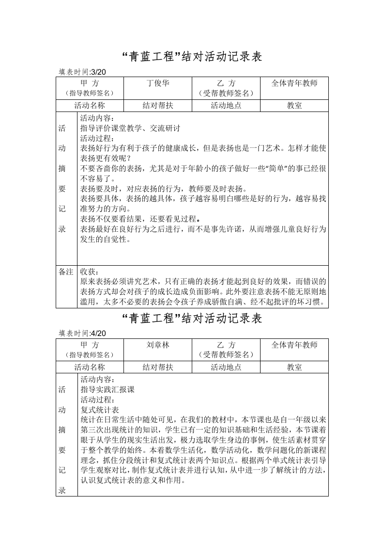 “青蓝工程”结对活动记录表填表时间:3/20甲方丁俊华乙方全体青年教师(指导教师签名)(受帮教师签名)活动名称结对帮扶活动地点教室活动内容:活指导评价课堂教学、交流研讨活动过程:动表扬好行为有利于孩子的健康成长,但是表扬也是一门艺术。怎样才能使表扬更有效呢?摘不要吝啬你的表扬,尤其是对于年龄小的孩子做好一些“简单”的事已经很不容易了。要表扬要及时,对应表扬的行为,教师要及时表扬。表扬要具体,表扬的越具体,孩子越容易明白哪些是好的行为,越容易找记准努力的方向。表扬不仅要看结果,还要看见过程。录表扬最好在良好行为之后进行,而不是事先许诺,从而增强儿童良好行为发生的自觉性。备注收获:原来表扬必须讲究艺术,只有正确的表扬才能起到良好的效果,而错误的表扬方式却会对孩子的成长造成负面影响。此外要注意表扬不能无原则地滥用,太多不必要的表扬会令孩子养成骄傲自满、经不起批评的坏习惯。“青蓝工程”结对活动记录表填表时间:4/20甲方刘章林乙方全体青年教师(指导教师签名)(受帮教师签名)活动名称结对帮扶活动地点教室活动内容:活指导实践汇报课活动过程:动复式统计表统计在日常生活中随处可见,在我们的教材中,本节课也是自一年级以来摘第三次出现统计的知识,学生已有一定的知识基础和生活经验,本节课着眼于从学生的现实生活出发,极力选取学生身边的事例,使生活素材贯穿要于整个教学的始终。本着数学生活化,数学活动化,数学问题化的新课程理念,抓住分段统计和复式统计表两个知识点。根据两个单式统计表引导记学生观察对比,制作复式统计表并进行认知,从中进一步了解统计的方法,认识复式统计表的意义和作用。录