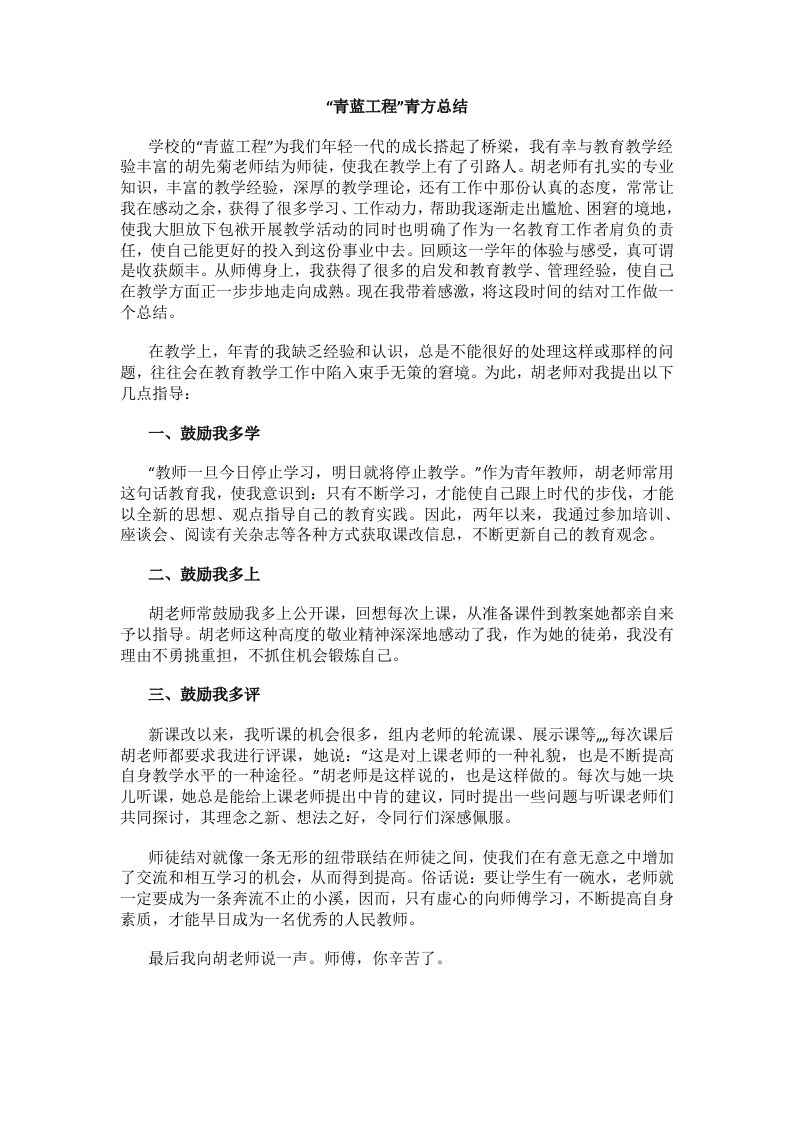 “青蓝工程”青方总结学校的“青蓝工程”为我们年轻一代的成长搭起了桥梁,我有幸与教育教学经验丰富的胡先菊老师结为师徒,使我在教学上有了引路人。胡老师有扎实的专业知识,丰富的教学经验,深厚的教学理论,还有工作中那份认真的态度,常常让我在感动之余,获得了很多学习、工作动力,帮助我逐渐走出尴尬、困窘的境地,使我大胆放下包袱开展教学活动的同时也明确了作为一名教育工作者肩负的责任,使自己能更好的投入到这份事业中去。回顾这一学年的体验与感受,真可谓是收获颇丰。从师傅身上,我获得了很多的启发和教育教学、管理经验,使自己在教学方面正一步步地走向成熟。现在我带着感激,将这段时间的结对工作做一个总结。在教学上,年青的我缺乏经验和认识,总是不能很好的处理这样或那样的问题,往往会在教育教学工作中陷入束手无策的窘境。为此,胡老师对我提出以下几点指导:一、鼓励我多学“教师一旦今日停止学习,明日就将停止教学。”作为青年教师,胡老师常用这句话教育我,使我意识到:只有不断学习,才能使自己跟上时代的步伐,才能以全新的思想、观点指导自己的教育实践。因此,两年以来,我通过参加培训、座谈会、阅读有关杂志等各种方式获取课改信息,不断更新自己的教育观念。二、鼓励我多上胡老师常鼓励我多上公开课,回想每次上课,从准备课件到教案她都亲自来予以指导。胡老师这种高度的敬业精神深深地感动了我,作为她的徒弟,我没有理由不勇挑重担,不抓住机会锻炼自己。三、鼓励我多评新课改以来,我听课的机会很多,组内老师的轮流课、展示课等,每次课后胡老师都要求我进行评课,她说:“这是对上课老师的一种礼貌,也是不断提高自身教学水平的一种途径。”胡老师是这样说的,也是这样做的。每次与她一块儿听课,她总是能给上课老师提出中肯的建议,同时提出一些问题与听课老师们共同探讨,其理念之新、想法之好,令同行们深感佩服。师徒结对就像一条无形的纽带联结在师徒之间,使我们在有意无意之中增加了交流和相互学习的机会,从而得到提高。俗话说:要让学生有一碗水,老师就一定要成为一条奔流不止的小溪,因而,只有虚心的向师傅学习,不断提高自身素质,才能早日成为一名优秀的人民教师。最后我向胡老师说一声。师傅,你辛苦了。