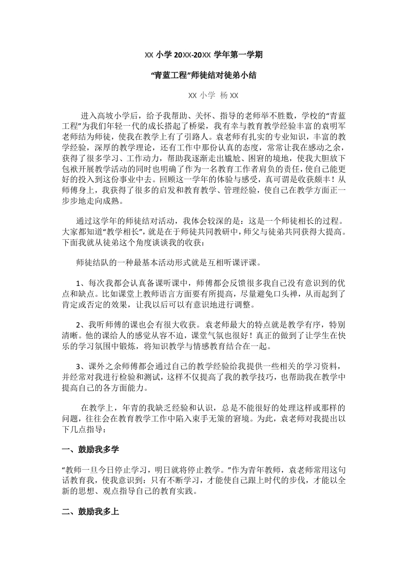 x小学20X-20x学年第一学期青蓝工程”师徒结对徒弟小结x小学杨X进入高坡小学后,给予我帮助、关怀、指导的老师举不胜数,学校的“青蓝工程”为我们年轻一代的成长搭起了桥梁,我有幸与教育教学经验丰富的袁明军老师结为师徒,使我在教学上有了引路人。袁老师有扎实的专业知识,丰富的教学经验,深厚的教学理论,还有工作中那份认真的态度,常常让我在感动之余,获得了很多学习、工作动力,帮助我逐渐走出尴尬、困窘的境地,使我大胆放下包袱开展教学活动的同时也明确了作为一名教育工作者肩负的责任,使自己能更好的投入到这份事业中去。回顾这一学年的体验与感受,真可谓是收获颇丰!从师傅身上,我获得了很多的启发和教育教学、管理经验,使自己在教学方面正一步步地走向成熟。通过这学年的师徒结对活动,我体会较深的是:这是一个师徒相长的过程。大家都知道“教学相长”,就是在于师徒共同教研中,师父与徒弟共同获得大提高。下面我就从徒弟这个角度谈谈我的收获:师徒结队的一种最基本活动形式就是互相听课评课。1、每次我都会认真备课听课中,师傅都会反馈很多我自己没有意识到的优点和缺点。比如课堂上教师语言方面要有所提高,尽量避免口头禅,从而起到了肯定或否定的效果,让我以后可以有意识地进行调整。2、我听师傅的课也会有很大收获。袁老师最大的特点就是教学有序,特别清晰。他的课给人的感觉从容不迫,课堂气氛也很好!真正的做到了让学生在快乐的学习氛围中锻炼,将知识教学与情感教育结合在一起。3、课外之余师傅都会通过自己的教学经验给我提供一些相关的学习资料,并经常对我进行检验和测试,这样不仅提高了我的教学技巧,也帮助我在教学中提高自己的各方面能力。在教学上,年青的我缺乏经验和认识,总是不能很好的处理这样或那样的问题,往往会在教育教学工作中陷入束手无策的窘境。为此,袁老师对我提出以下几点指导:一、鼓励我多学“教师一旦今日停止学习,明日就将停止教学。”作为青年教师,袁老师常用这句话教育我,使我意识到:只有不断学习,才能使自己跟上时代的步伐,才能以全新的思想、观点指导自己的教育实践。二、鼓励我多上