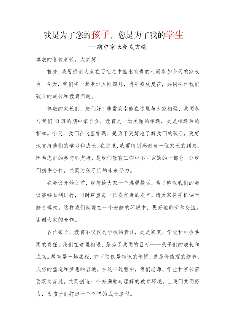 我是为了您的孩子,您是为了我的学生-期中家长会发言稿尊敬的各位家长,大家好!首先,我要感谢大家在百忙之中抽出宝贵的时间参加今天的家长会。今天,我们将一起走过人问四月,携手盛放夏花,共同探讨我们孩子的成长和教育问题。尊敬的家长们,您们好!非常荣幸能在这里与大家相聚,共同参与我们18班的期中家长会。教育是一场美丽的相遇,更是相遇后的相知。今天,我们在这里相遇,是为了更好地了解我们的孩子,更好地支持他们的学习和成长。在这里,我要特别感谢每一位家长的到来,因为您们的参与和支持,是我们教育工作中不可或缺的一部分。让我们携手合作,共同为孩子们的未来努力。在会议开始之前,我想给大家一个温馨提示。为了确保我们的会议能够顺利进行,同时尊重每一位发言者的发言,请大家将手机调至静音模式。这样我们就能在一个安静的环境中,更好地聆听和交流。谢谢大家的合作。各位家长,教育不仅仅是学校的责任,更是家庭、学校和社会共同的责任。我们在这里相遇,是为了共同的目标一一孩子们的成长和成功。教育是一场旅程,它不仅仅是知识的传授,更是价值观的培养、人格的塑造和梦想的启迪。在这个过程中,我们老师、学生和家长需要双向奔赴,共同创造一个充满爱与理解的教育环境。让我们共同努力,为孩子们打造一个幸福的成长旅程。