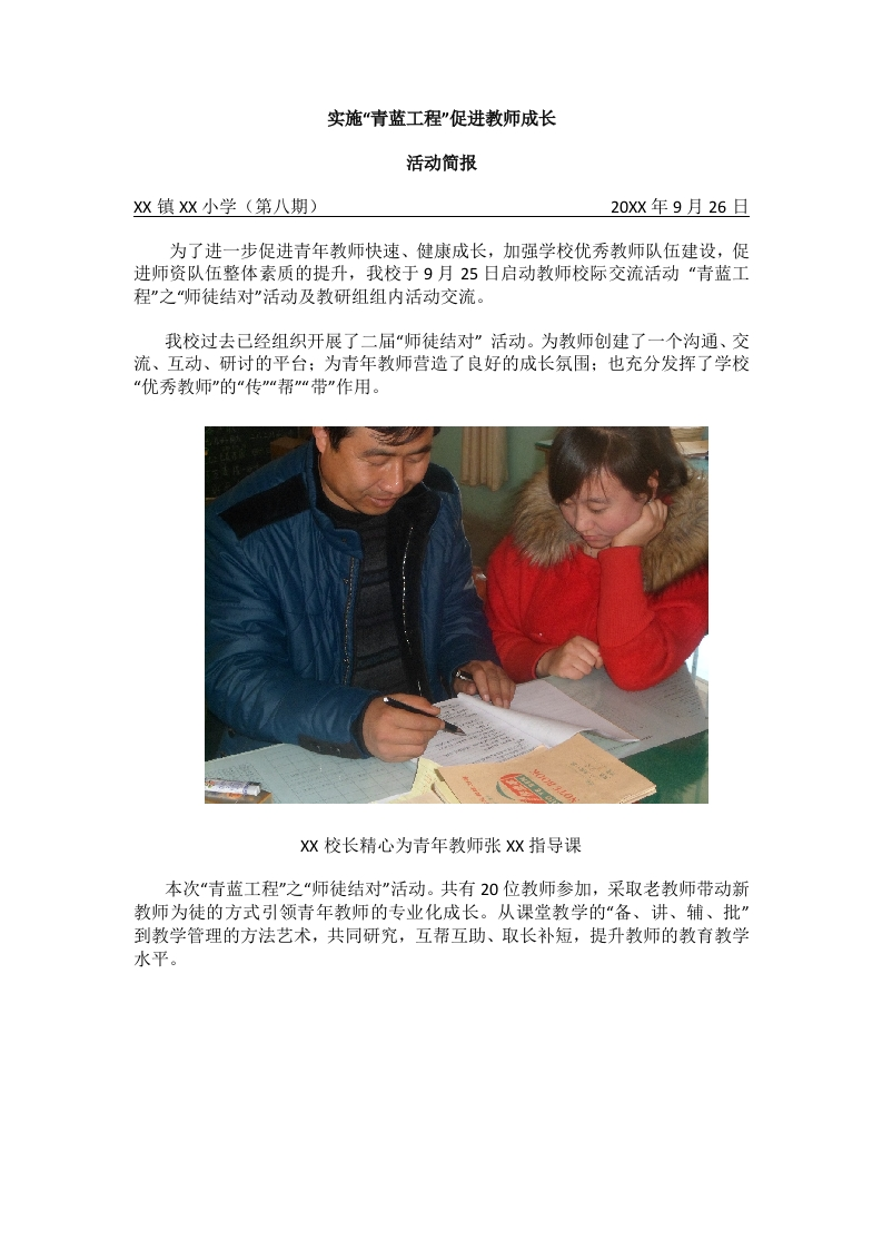 实施“青蓝工程”促进教师成长活动简报x镇x小学(第八期)20Xx年9月26日为了进一步促进青年教师快速、健康成长,加强学校优秀教师队伍建设,促进师资队伍整体素质的提升,我校于9月25日启动教师校际交流活动“青蓝工程”之“师徒结对”活动及教研组组内活动交流。我校过去已经组织开展了二届“师徒结对”活动。为教师创建了一个沟通、交流、互动、研讨的平台:为青年教师营造了良好的成长氛围:也充分发挥了学校“优秀教师”的“传”“帮“带”作用。x校长精心为青年教师张x指导课本次“青蓝工程”之“师徒结对"”活动。共有20位教师参加,采取老教师带动新教师为徒的方式引领青年教师的专业化成长。从课堂教学的“备、讲、辅、批到教学管理的方法艺术,共同研究,互帮互助、取长补短,提升教师的教育教学水平。