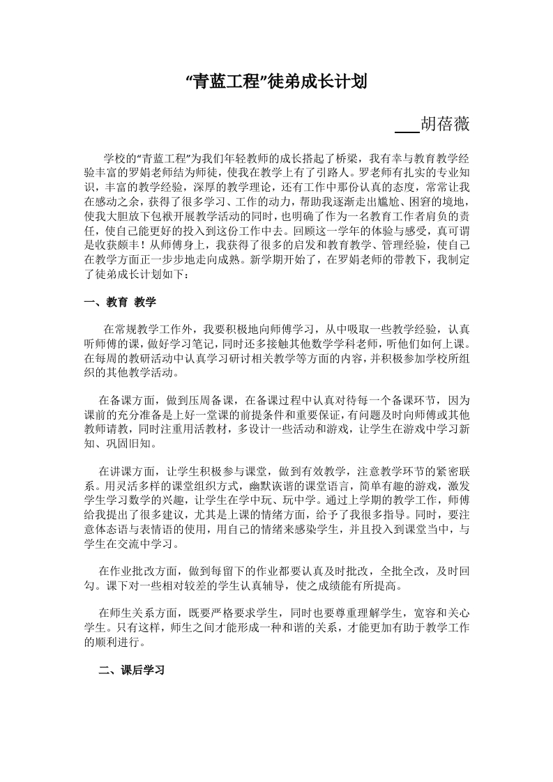 “青蓝工程”徒弟成长计划胡蓓薇学校的“青蓝工程”为我们年轻教师的成长搭起了桥梁,我有幸与教育教学经验丰富的罗娟老师结为师徒,使我在教学上有了引路人。罗老师有扎实的专业知识,丰富的教学经验,深厚的教学理论,还有工作中那份认真的态度,常常让我在感动之余,获得了很多学习、工作的动力,帮助我逐渐走出尴尬、困窘的境地,使我大胆放下包袱开展教学活动的同时,也明确了作为一名教育工作者肩负的责任,使自己能更好的投入到这份工作中去。回顾这一学年的体验与感受,真可谓是收获颇丰!从师傅身上,我获得了很多的启发和教育教学、管理经验,使自己在教学方面正一步步地走向成熟。新学期开始了,在罗娟老师的带教下,我制定了徒弟成长计划如下:一、教育教学在常规教学工作外,我要积极地向师傅学习,从中吸取一些教学经验,认真听师傅的课,做好学习笔记,同时还多接触其他数学学科老师,听他们如何上课。在每周的教研活动中认真学习研讨相关教学等方面的内容,并积极参加学校所组织的其他教学活动。在备课方面,做到压周备课,在备课过程中认真对待每一个备课环节,因为课前的充分准备是上好一堂课的前提条件和重要保证,有问题及时向师傅或其他教师请教,同时注重用活教材,多设计一些活动和游戏,让学生在游戏中学习新知、巩固旧知。在讲课方面,让学生积极参与课堂,做到有效教学,注意教学环节的紧密联系。用灵活多样的课堂组织方式,幽默诙谐的课堂语言,简单有趣的游戏,激发学生学习数学的兴趣,让学生在学中玩、玩中学。通过上学期的教学工作,师傅给我提出了很多建议,尤其是上课的情绪方面,给予了我很多指导。同时,要注意体态语与表情语的使用,用自己的情绪来感染学生,并且投入到课堂当中,与学生在交流中学习。在作业批改方面,做到每留下的作业都要认真及时批改,全批全改,及时回勾。课下对一些相对较差的学生认真辅导,使之成绩能有所提高。在师生关系方面,既要严格要求学生,同时也要尊重理解学生,宽容和关心学生。只有这样,师生之间才能形成一种和谐的关系,才能更加有助于教学工作的顺利进行。二、课后学习