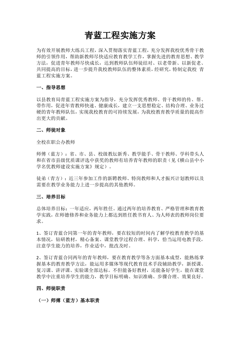 青蓝工程实施方案为有效开展教师大练兵工程,深入贯彻落实青蓝工程,充分发挥我校优秀骨干教师的引领作用,帮助新教师尽快适应教育教学工作,掌握先进的教育思想、教学方法,促进青年教师尽快成长,达到教师队伍师徒结对、以老带新、以新促老、共同提高的目标,进一步提升我校教师队伍的整体素质,经研究,特制定我校青蓝工程实施方案。一、指导思想以县教育局青蓝工程实施方案为指导,充分发挥优秀教师、骨干教师的传、帮、带作用,促进年青教师快速、健康成长,建立一支思想稳定、结构合理、业务过硬的青年教师队伍,实现我校教育的可持续发展,为我校教育教学质量的提高作出更大的贡献。二、师徒对象全校在职公办教师师傅(蓝方):省、市、县、校级教坛新秀、教学能手、骨干教师、学科带头人和在省市县级优质课评选中获奖的教师有培养青年教师的职责(见《横山县中小学名优教师建设实施方案》规定)。徒弟(青方):近三年参加工作的新聘教师、特岗教师和人才振兴计划教师以及需要在教学业务能力上进一步提高的其他教师。三、培养目标总体培养目标:一年适应,两年胜任。通过两年的培养教育、严格管理和教育教学实践,在师德修养和业务能力上都达到胜任教书育人、为人师表的教师岗位要求。1、签订青蓝合同第一年的青年教师,要在较短的时间内了解学校教育教学的基本情况,钻研教材,精心备案、课堂教学过程合理、科学,恰当运用电教手段,注意学生能力的培养,作业适中,批改及时。2、签订青蓝合同两年的青年教师,要在教育教学等各方面基本成型,能熟练掌握基本的教育教学方法,能运用多媒体等现代教育技术手段辅助教学,新授课、复习课、讲评课、实验课全部达标。不但能备好教材,还能备好学生,能在课堂教学中注重培养学生的能力,教学目标明确、知识准确、步骤合理、效果良好。四、师徒职责(一)师傅(蓝方)基本职责