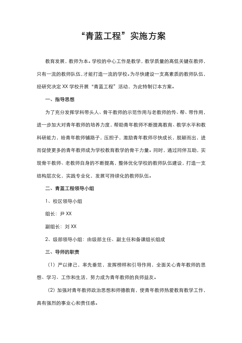 “青蓝工程”实施方案教育发展,教师为本。学校的中心工作是教学,教学质量的高低关键在教师,只有一流的教师队伍,才能打造一流的学校。为尽快建设一支高素质的教师队伍,经研究决定X学校开展“青蓝工程”活动,为此特制订本方案。一、指导思想为了充分发挥学科带头人、骨干教师的示范作用与老教师的传、帮、带作用,进一步加大对青年教师的培养力度,帮助青年教师不断提高教育、教学水平和教科研能力,给青年教师铺路子,压担子,激励青年教师尽快成长,脱颖而出,进而促使更多的青年教师成为学校教育教学的骨干力量。同时,通过同伴互助,实现骨干教师、老教师自身的不断提高,整体优化学校的教师队伍建设,打造一支结构层次化,实践专业化,发展可持续化的教师队伍。二、青蓝工程领导小组1、校区领导小组组长:尹XX副组长:刘X2、级部领导小组:由级部主任、副主任和备课组长组成三、导师的职责(1)严以律己,率先垂范,发挥榜样和引导作用,全面关心青年教师的思想、学习、工作和生活,努力成为青年教师的良师益友。(2)加强对青年教师政治思想和师德教育,使青年教师热爱教育教学工作,具有强烈的事业心和责任感。