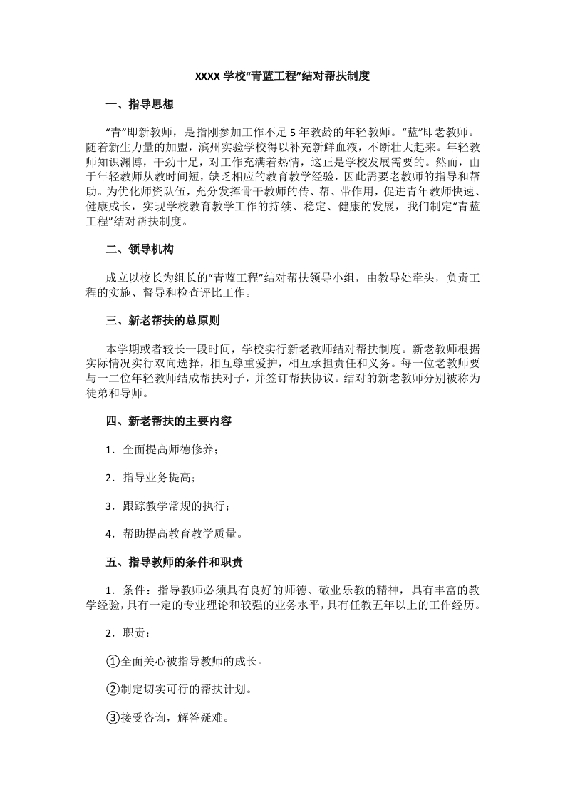 XX学校“青蓝工程”结对帮扶制度一、指导思想“青”即新教师,是指刚参加工作不足5年教龄的年轻教师。“蓝”即老教师。随着新生力量的加盟,滨州实验学校得以补充新鲜血液,不断壮大起来。年轻教师知识渊博,干劲十足,对工作充满着热情,这正是学校发展需要的。然而,由于年轻教师从教时间短,缺乏相应的教育教学经验,因此需要老教师的指导和帮助。为优化师资队伍,充分发挥骨干教师的传、帮、带作用,促进青年教师快速、健康成长,实现学校教育教学工作的持续、稳定、健康的发展,我们制定“青蓝工程”结对帮扶制度。二、领导机构成立以校长为组长的“青蓝工程”结对帮扶领导小组,由教导处牵头,负责工程的实施、督导和检查评比工作。三、新老帮扶的总原则本学期或者较长一段时间,学校实行新老教师结对帮扶制度。新老教师根据实际情况实行双向选择,相互尊重爱护,相互承担责任和义务。每一位老教师要与一二位年轻教师结成帮扶对子,并签订帮扶协议。结对的新老教师分别被称为徒弟和导师。四、新老帮扶的主要内容1.全面提高师德修养:2.指导业务提高:3.跟踪教学常规的执行:4.帮助提高教育教学质量。五、指导教师的条件和职责1.条件:指导教师必须具有良好的师德、敬业乐教的精神,具有丰富的教学经验,具有一定的专业理论和较强的业务水平,具有任教五年以上的工作经历。2.职责:①全面关心被指导教师的成长。②制定切实可行的帮扶计划。③接受咨询,解答疑难。