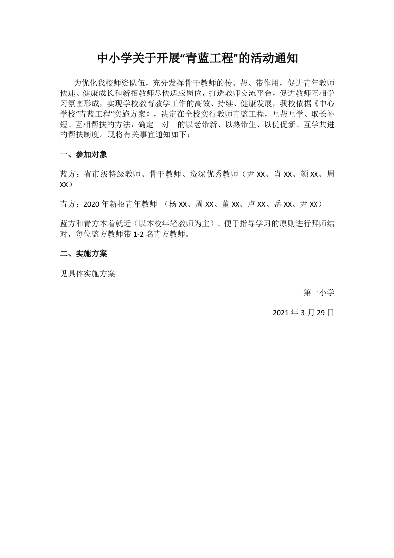 中小学关于开展“青蓝工程”的活动通知为优化我校师资队伍,充分发挥骨干教师的传、帮、带作用,促进青年教师快速、健康成长和新招教师尽快适应岗位,打造教师交流平台,促进教师互相学习氛围形成,实现学校教育教学工作的高效、持续、健康发展,我校依据《中心学校“青蓝工程”实施方案》,决定在全校实行教师青蓝工程,互帮互学、取长补短、互相帮扶的方法,确定一对一的以老带新、以熟带生、以优促新、互学共进的帮扶制度。现将有关事宜通知如下:一、参加对象蓝方:省市级特级教师、骨干教师、资深优秀教师(尹x、肖x、颜x、周XX)青方:2020年新招青年教师(杨x、周x、董X、卢X、岳X、尹X)蓝方和青方本着就近(以本校年轻教师为主)、便于指导学习的原则进行拜师结对,每位蓝方教师带1-2名青方教师。二、实施方案见具体实施方案第一小学2021年3月29日