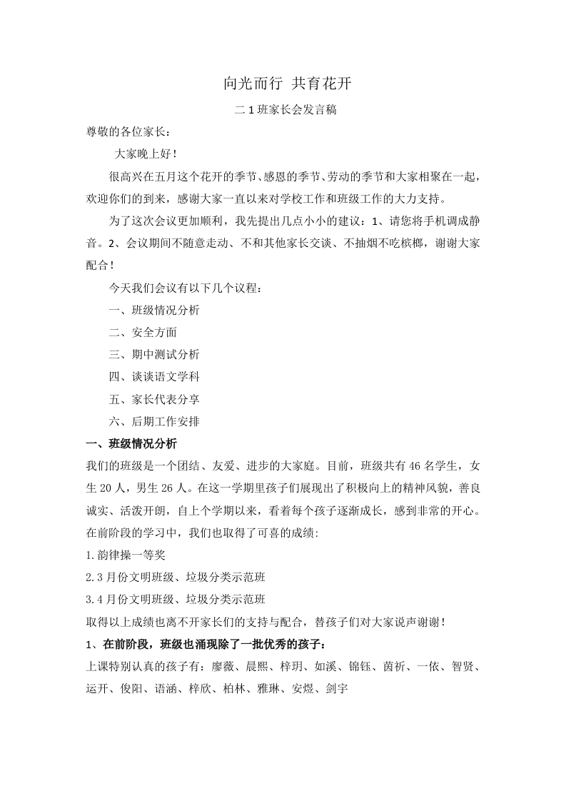 向光而行共育花开二1班家长会发言稿尊敬的各位家长:大家晚上好!很高兴在五月这个花开的季节、感恩的季节、劳动的季节和大家相聚在一起,欢迎你们的到来,感谢大家一直以来对学校工作和班级工作的大力支持。为了这次会议更加顺利,我先提出几点小小的建议:1、请您将手机调成静音。2、会议期间不随意走动、不和其他家长交谈、不抽烟不吃槟榔,谢谢大家配合!今天我们会议有以下几个议程:一、班级情况分析二、安全方面三、期中测试分析四、谈谈语文学科五、家长代表分享六、后期工作安排一、班级情况分析我们的班级是一个团结、友爱、进步的大家庭。目前,班级共有46名学生,女生20人,男生26人。在这一学期里孩子们展现出了积极向上的精神风貌,善良诚实、活泼开朗,自上个学期以来,看着每个孩子逐渐成长,感到非常的开心。在前阶段的学习中,我们也取得了可喜的成绩:1.韵律操一等奖2.3月份文明班级、垃圾分类示范班3.4月份文明班级、垃圾分类示范班取得以上成绩也离不开家长们的支持与配合,替孩子们对大家说声谢谢!1、在前阶段,班级也涌现除了一批优秀的孩子:上课特别认真的孩子有:廖薇、晨熙、梓玥、如溪、锦钰、茵祈、一依、智贤、运开、俊阳、语涵、梓欣、柏林、雅琳、安煜、剑宇
