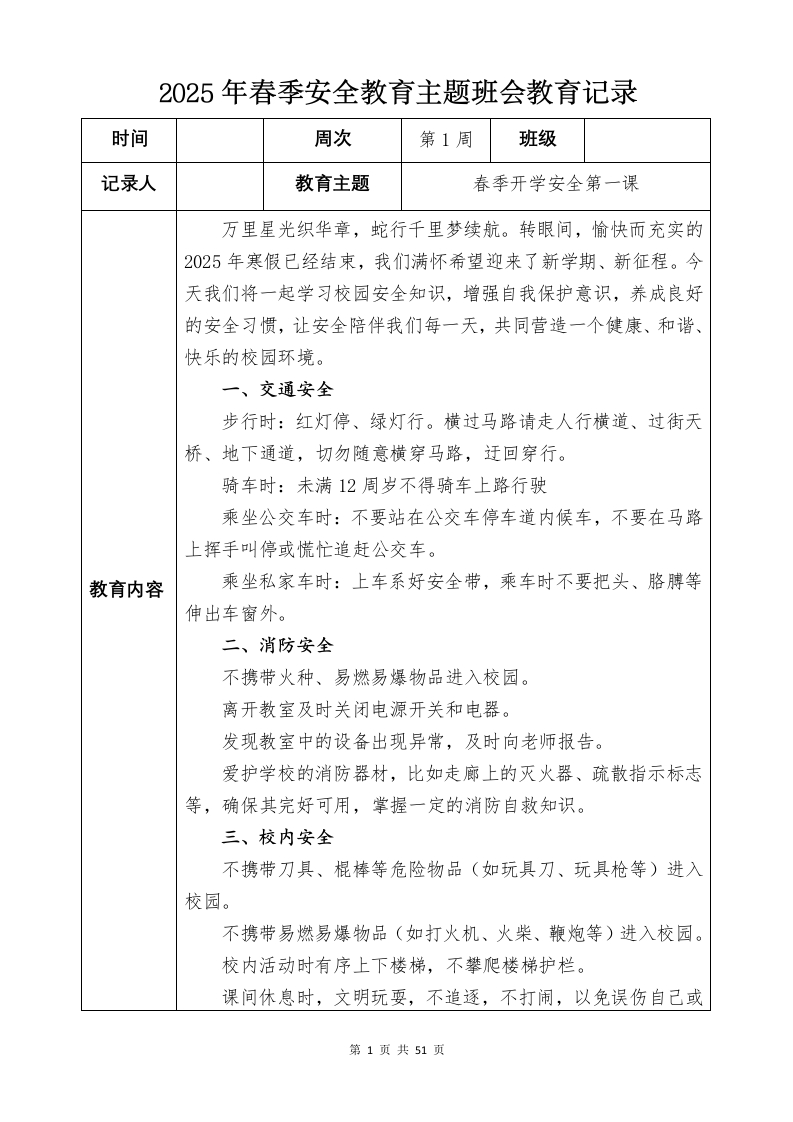 2025年春季安全教育主题班会教育记录时间周次第1周班级记录人教育主题春季开学安全第一课万里星光织华章,蛇行千里梦续航。转眼间,愉快而充实的2025年寒假已经结束,我们满怀希望迎来了新学期、新征程。今天我们将一起学习校园安全知识,增强自我保护意识,养成良好的安全习惯,让安全陪伴我们每一天,共同营造一个健康、和谐、快乐的校园环境。一、交通安全步行时:红灯停、绿灯行。横过马路请走人行横道、过街天桥、地下通道,切勿随意横穿马路,迂回穿行。骑车时:未满12周岁不得骑车上路行驶乘坐公交车时:不要站在公交车停车道内候车,不要在马路上挥手叫停或慌忙追赶公交车。教育内容乘坐私家车时:上车系好安全带,乘车时不要把头、胳膊等伸出车窗外。二、消防安全不携带火种、易燃易爆物品进入校园。离开教室及时关闭电源开关和电器。发现教室中的设备出现异常,及时向老师报告。爱护学校的消防器材,比如走廊上的灭火器、疏散指示标志等,确保其完好可用,掌握一定的消防自救知识。三、校内安全不携带刀具、棍棒等危险物品(如玩具刀、玩具枪等)进入校园。不携带易燃易爆物品(如打火机、火柴、鞭炮等)进入校园。校内活动时有序上下楼梯,不攀爬楼梯护栏。课间休息时,文明玩耍,不追逐,不打闹,以免误伤自己或第1页共51页