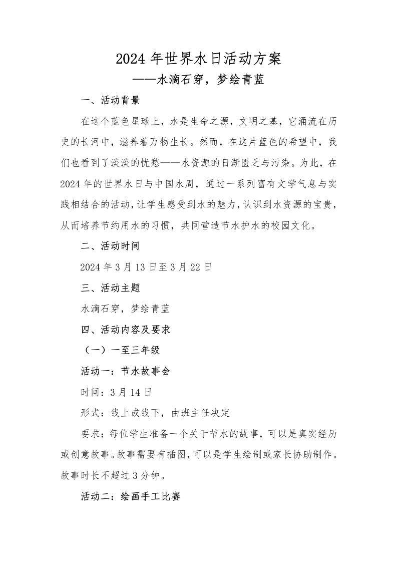 2024年世界水日活动方案一一水滴石穿,梦绘青蓝一、活动背景在这个蓝色星球上,水是生命之源,文明之基,它涌流在历史的长河中,滋养着万物生长。然而,在这片蓝色的希望中,我们也看到了淡淡的忧愁一一水资源的日渐匮乏与污染。为此,在2024年的世界水日与中国水周,通过一系列富有文学气息与实践相结合的活动,让学生感受到水的魅力,认识到水资源的宝贵,从而培养节约用水的习惯,共同营造节水护水的校园文化。二、活动时间2024年3月13日至3月22日三、活动主题水滴石穿,梦绘青蓝四、活动内容及要求(一)一至三年级活动一:节水故事会时间:3月14日形式:线上或线下,由班主任决定要求:每位学生准备一个关于节水的故事,可以是真实经历或创意故事。故事需要有插图,可以是学生绘制或家长协助制作。故事时长不超过3分钟。活动二:绘画手工比赛