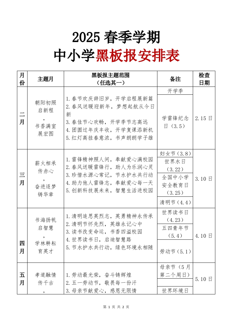 2025春季学期中小学黑板报安排表份主题月黑板报主题范围(任选其一)备注检查日期开学季1.春节欢庆辞旧岁,开学启程展新篇朝阳初照2.春风送暖迎新年,梦想起航从今日二启新程新月学雷锋纪念2.15日书香满室3.春佳节心欢畅,开学季节志高远日(3.5)展宏图4.团圆过年庆丰收,开学复课添新机5.红灯高挂春意浓,书声朗朗学子雄妇女节(3.8)1.雷锋精神照人间,奉献爱心满校园薪火相承世界水日2.春风送暖雷锋行,助人为乐润心灵三传赤心(3.22)3.珍惜水源心常记,节水护水共行动全国中小学3.10日4.助力他人雷锋志,奉献爱心每一天奋进逐梦安全教育日5.创新科技展未来,智慧生活进校园铸华章(3.25)清明节(4.4)书海扬帆1.清明追思英烈志,英勇精神永传承世界读书日(4.23)启智慧2.清明节怀先烈,英雄永记心中五四青年节3.读书改变命运,书香四溢校园(5.4)4.10日学林耕耘4.世界读书日,启迪智慧路月育英才5.节水护水共行动,绿色环境永相随劳动节(5.1)母亲节(5月五孝道融情1.劳动最光荣,奋斗铸辉煌第二个周日)月传千古2.五一劳动节,敬畏每一份汗5.10日3.母亲节献爱心,感恩无限情世界环境日第1页共2页
