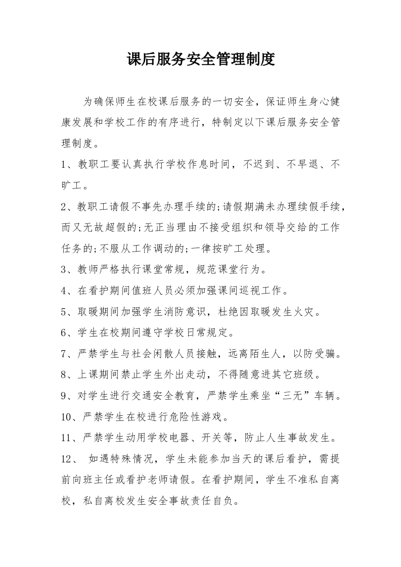课后服务安全管理制度为确保师生在校课后服务的一切安全,保证师生身心健康发展和学校工作的有序进行,特制定以下课后服务安全管理制度。1、教职工要认真执行学校作息时间,不迟到、不早退、不旷工。2、教职工请假不事先办理手续的;请假期满未办理续假手续,而又无故超假的;无正当理由不接受组织和领导交给的工作任务的;不服从工作调动的;一律按旷工处理。3、教师严格执行课堂常规,规范课堂行为。4、在看护期间值班人员必须加强课间巡视工作。5、取暖期间加强学生消防意识,杜绝因取暖发生火灾。6、学生在校期间遵守学校日常规定。7、严禁学生与社会闲散人员接触,远离陌生人,以防受骗。8、上课期间禁止学生外出走动,不得随意进其它班级。9、对学生进行交通安全教育,严禁学生乘坐“三无”车辆。10、严禁学生在校进行危险性游戏。11、严禁学生动用学校电器、开关等,防止人生事故发生。12、如遇特殊情况,学生未能参加当天的课后看护,需提前向班主任或看护老师请假。在看护期间,学生不准私自离校,私自离校发生安全事故责任自负。