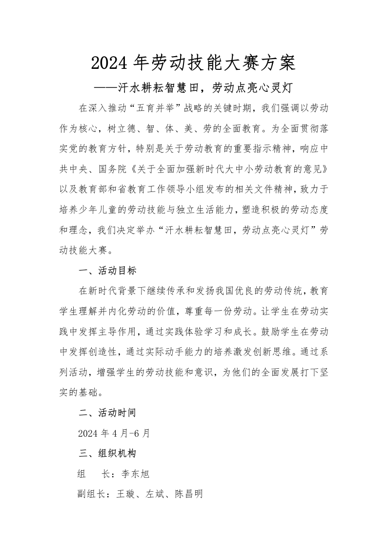 2024年劳动技能大赛方案汗水耕耘智慧田,劳动点亮心灵灯在深入推动“五育并举”战略的关键时期,我们强调以劳动作为核心,树立德、智、体、美、劳的全面教育。为全面贯彻落实党的教育方针,特别是关于劳动教育的重要指示精神,响应中共中央、国务院《关于全面加强新时代大中小劳动教育的意见》以及教育部和省教育工作领导小组发布的相关文件精神,致力于培养少年儿童的劳动技能与独立生活能力,塑造积极的劳动态度和理念,我们决定举办“汗水耕耘智慧田,劳动点亮心灵灯”劳动技能大赛。一、活动目标在新时代背景下继续传承和发扬我国优良的劳动传统,教育学生理解并内化劳动的价值,尊重每一份劳动。让学生在劳动实践中发挥主导作用,通过实践体验学习和成长。鼓励学生在劳动中发挥创造性,通过实际动手能力的培养激发创新思维。通过系列活动,增强学生的劳动技能和意识,为他们的全面发展打下坚实的基础。二、活动时间2024年4月-6月三、组织机构组长:李东旭副组长:王璇、左斌、陈昌明