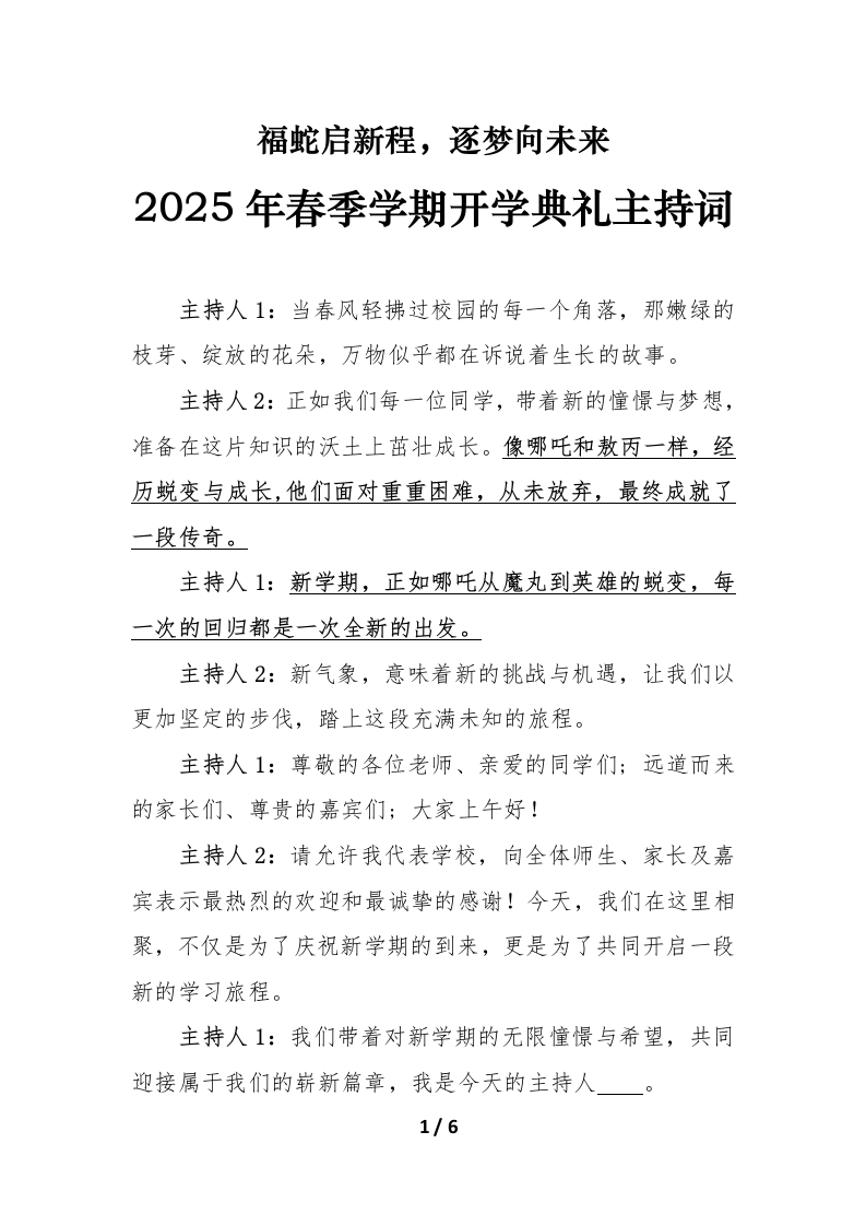福蛇启新程,逐梦向未来2025年春季学期开学典礼主持词主持人1:当春风轻拂过校园的每一个角落,那嫩绿的枝芽、绽放的花朵,万物似乎都在诉说着生长的故事。主持人2:正如我们每一位同学,带着新的憧憬与梦想,准备在这片知识的沃土上茁壮成长。像哪吒和敖丙一样,经历蜕变与成长,他们面对重重困难,从未放弃,最终成就了一段传奇。主持人1:新学期,正如哪吒从魔丸到英雄的蜕变,每一次的回归都是一次全新的出发。主持人2:新气象,意味着新的挑战与机遇,让我们以更加坚定的步伐,踏上这段充满未知的旅程。主持人1:尊敬的各位老师、亲爱的同学们;远道而来的家长们、尊贵的嘉宾们;大家上午好!主持人2:请允许我代表学校,向全体师生、家长及嘉宾表示最热烈的欢迎和最诚挚的感谢!今天,我们在这里相聚,不仅是为了庆祝新学期的到来,更是为了共同开启一段新的学习旅程。主持人1:我们带着对新学期的无限憧憬与希望,共同迎接属于我们的崭新篇章,我是今天的主持人。1/6