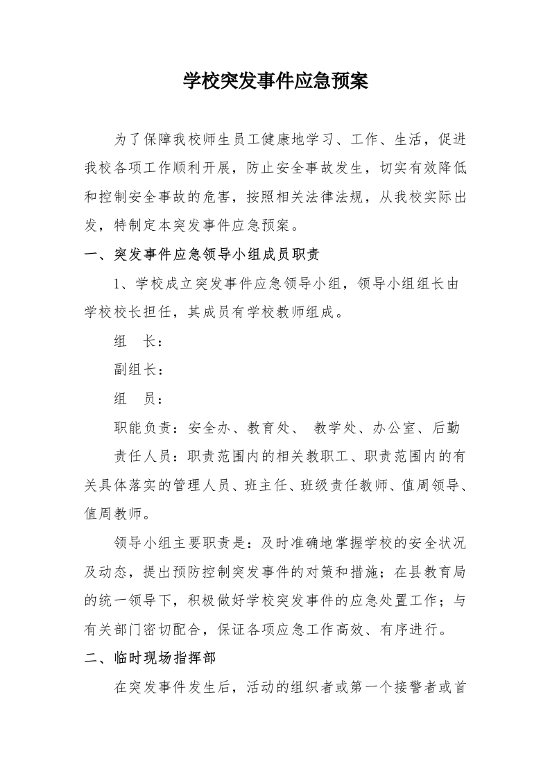 学校突发事件应急预案为了保障我校师生员工健康地学习、工作、生活,促进我校各项工作顺利开展,防止安全事故发生,切实有效降低和控制安全事故的危害,按照相关法律法规,从我校实际出发,特制定本突发事件应急预案。一、突发事件应急领导小组成员职责1、学校成立突发事件应急领导小组,领导小组组长由学校校长担任,其成员有学校教师组成。组长:副组长:组员:职能负责:安全办、教育处、教学处、办公室、后勤责任人员:职责范围内的相关教职工、职责范围内的有关具体落实的管理人员、班主任、班级责任教师、值周领导、值周教师。领导小组主要职责是:及时准确地掌握学校的安全状况及动态,提出预防控制突发事件的对策和措施:在县教育局的统一领导下,积极做好学校突发事件的应急处置工作;与有关部门密切配合,保证各项应急工作高效、有序进行。二、临时现场指挥部在突发事件发生后,活动的组织者或第一个接警者或首