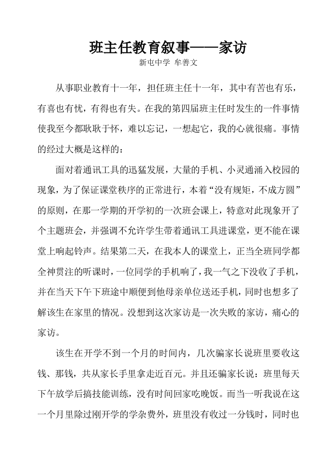 班主任教育叙事一一家访新屯中学牟善文从事职业教育十一年,担任班主任十一年,其中有苦也有乐,有喜也有忧,有得也有失。在我的第四届班主任时发生的一件事情使我至今都耿耿于怀,难以忘记,一想起它,我的心就很痛。事情的经过大概是这样的:面对着通讯工具的迅猛发展,大量的手机、小灵通涌入校园的现象,为了保证课堂秩序的正常进行,本着“没有规矩,不成方圆”的原则,在那一学期的开学初的一次班会课上,特意对此现象开了个主题班会,并强调不允许学生带着通讯工具进课堂,更不能在课堂上响起铃声。结果第二天,在我本人的课堂上,正当全班同学都全神贯注的听课时,一位同学的手机响了,我一气之下没收了手机,并在当天下午下班途中顺便到他母亲单位送还手机,同时也想多了解该生在家里的情况。没想到这次家访是一次失败的家访,痛心的家访。该生在开学不到一个月的时间内,几次骗家长说班里要收这钱、那钱,共从家长手里拿走近百元。并且还骗家长说:班里每天下午放学后搞技能训练,没有时间回家吃晚饭。而当一听我说在这一个月里除过刚开学的学杂费外,班里没有收过一分钱时,同时也