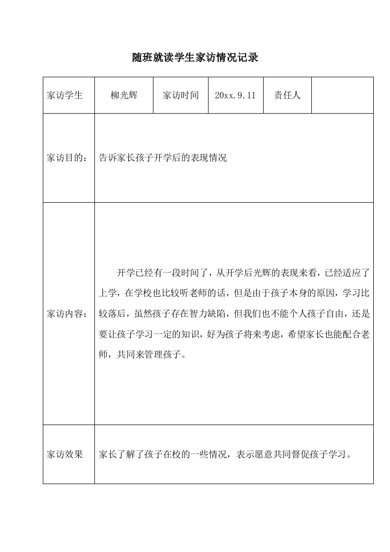 随班就读学生家访情况记录家访学生柳光辉家访时间20xx.9.11责任人家访目的:告诉家长孩子开学后的表现情况开学已经有一段时间了,从开学后光辉的表现来看,己经适应了上学,在学校也比较听老师的话,但是由于孩子本身的原因,学习比家访内容:较落后,虽然孩子存在智力缺陷,但我们也不能个人孩子自由,还是要让孩子学习一定的知识,好为孩子将来考虑,希望家长也能配合老师,共同来管理孩子。家访效果家长了解了孩子在校的一些情况,表示愿意共同督促孩子学习。