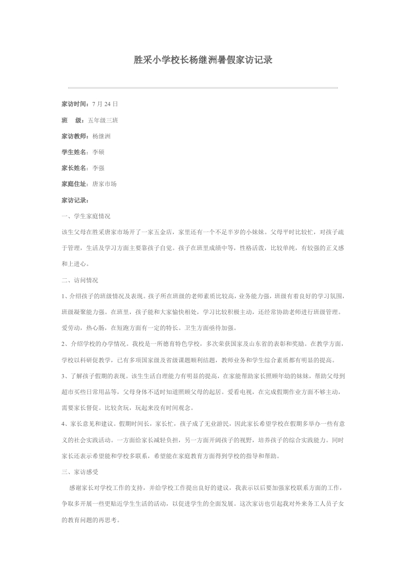 胜采小学校长杨继洲暑假家访记录家访时间:7月24日班级:五年级三班家访教师:杨继洲学生姓名:李硕家长姓名:李强家庭住址:唐家市场家访记录一、学生家庭情况该生父母在胜采唐家市场开了一家五金店,家里还有一个不足半岁的小妹妹。父母平时比较忙,对孩子疏于管理,生活及学习方面主要靠孩子自觉。孩子在班里成绩中等,性格活泼,比较单纯,有较强的正义感和上进心二、访问情况1、介绍孩子的班级情况及表现。孩子所在班级的老师素质比较高,业务能力强,班级有着良好的学习氛围,班级凝聚能力强。在班里,孩子能和大家愉快相处,学习比较积极主动,还经常协助老师进行班级管理。爱劳动,热心肠,在短跑方面有一定的特长。卫生方面亟待加强。2、介绍学校的办学情况。我校是一所德育特色学校,多次荣获国家及山东省的表彩和奖励。在教学方面,学校以科研促教学,已有多项国家级及省级课趣顺利结趣,教师业务和学生综合素质都有明显的提高。3、了解孩子假期的表现。该生生活自理能力有明显的提高,在家能帮助家长照顾年幼的妹妹,帮助父母到超市买些日常用品等,父母身体不适时知道照顾父母的起居。爱看电视,在完成假期作业方面不够主动,需要家长督促。比较贪玩,玩起来没有时间观念4、家长意见和建议。假期时间长,家长忙,孩子成了无业游民,因此家长希望学校在假期多举办一些有意义的社会实践活动。一方面给家长减轻负担,另一方面开阔孩子的视野,培养孩子的综合实践能力。同时家长还表示希望能和学校多联系,希望能在家庭教育方面得到学校的指导和帮助。三、家访感受感谢家长对学校工作的支持,并给学校工作提出良好的建议,我表示以后要加强家校联系方面的工作,争取多开展一些更贴近学生生活的活动,以促进学生的全面发展。这次家访也引起我对外来务工人员子女的教育问趣的再思考。