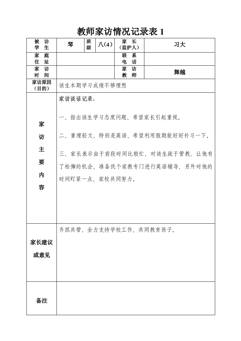 教师家访情况记录表1被访学生琴家长级八(4)(监护人)习大家庭联系住址电话家访家访时间教师舞越家访原因(目的)该生本期学习成绩不够理想家访谈话记录:一、指出该生学习态度问题,希望家长引起重视。家访二、重理轻文,特别是英语,希望利用假期能好好补习一下。主三、家长表示由于前段时间比较忙,对该生疏于管教,让他有要了松懈的机会,准备找个家教专门进行英语辅导,另外对他的内时间盯紧一点,家校共同努力。容齐抓共管,全力支持学校工作,共同教育孩子。家长建议或意见备注
