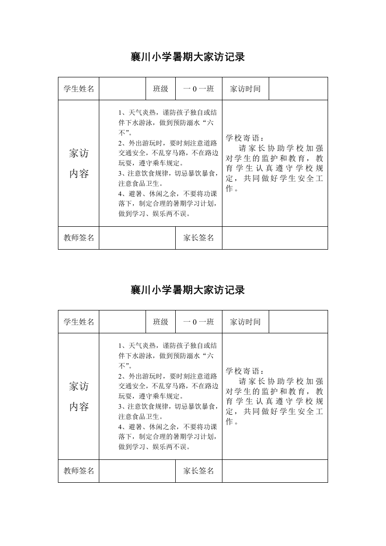 襄川小学暑期大家访记录学生姓名班级一0一班家访时间1、天气炎热,谨防孩子独自或结伴下水游泳,做到预防溺水“六不”。2、外出游玩时,要时刻注意道路学校寄语:家访交通安全,不乱穿马路,不在路边请家长协助学校加强玩耍,遵守乘车规定。对学生的监护和教育,教内容育学生认真遵守学校规3、注意饮食规律,切忌暴饮暴食,定,共同做好学生安全工注意食品卫生。作。4、避暑、休闲之余,不要将功课落下,制定合理的暑期学习计划,做到学习、娱乐两不误。教师签名家长签名襄川小学暑期大家访记录学生姓名班级一0一班家访时间1、天气炎热,谨防孩子独自或结伴下水游泳,做到预防溺水“六不”。学校寄语:2、外出游玩时,要时刻注意道路家访交通安全,不乱穿马路,不在路边请家长协助学校加强玩耍,遵守乘车规定。对学生的监护和教育,教内容3、注意饮食规律,切忌暴饮暴食,育学生认真遵守学校规定,共同做好学生安全工注意食品卫生。作。4、避暑、休闲之余,不要将功课落下,制定合理的暑期学习计划,做到学习、娱乐两不误。教师签名家长签名