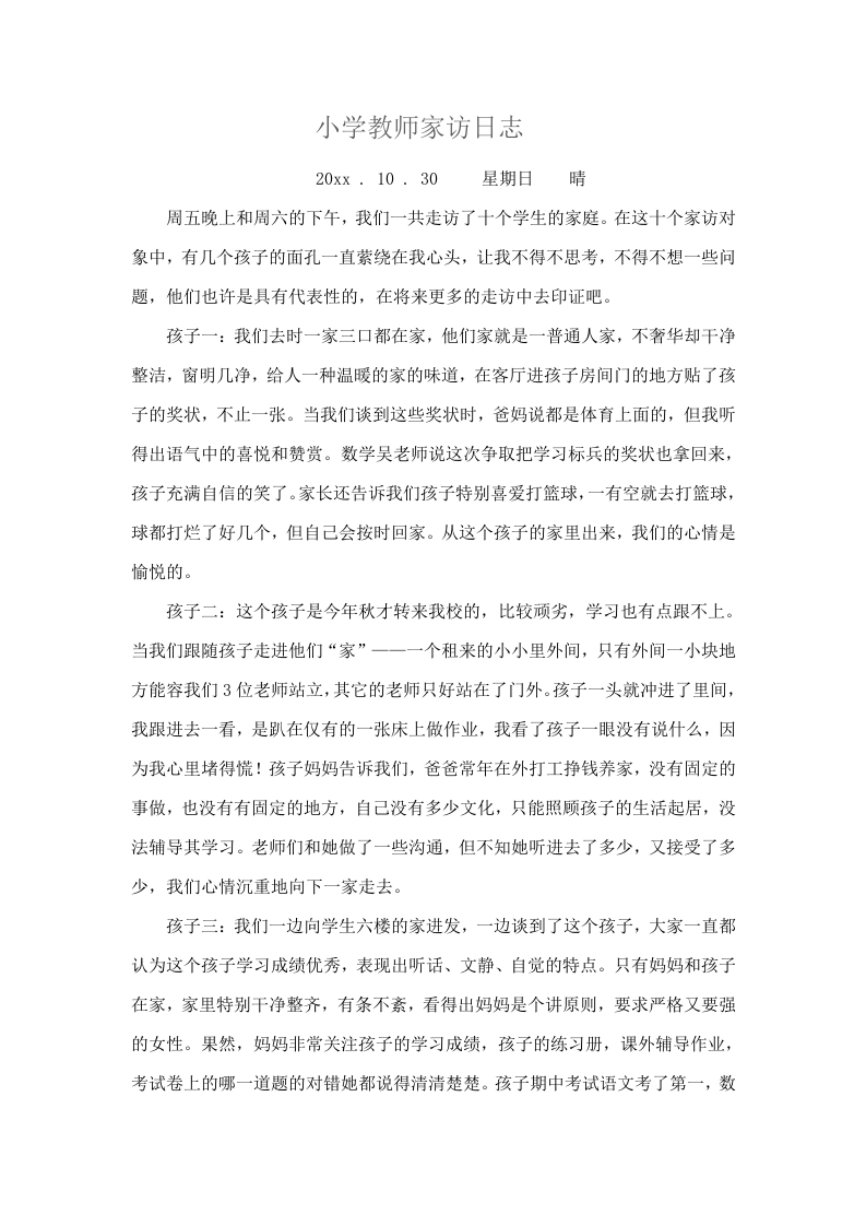 小学教师家访日志20xx.10.30星期日晴周五晚上和周六的下午,我们一共走访了十个学生的家庭。在这十个家访对象中,有几个孩子的面孔一直萦绕在我心头,让我不得不思考,不得不想一些问题,他们也许是具有代表性的,在将来更多的走访中去印证吧。孩子一:我们去时一家三口都在家,他们家就是一普通人家,不奢华却干净整洁,窗明几净,给人一种温暖的家的味道,在客厅进孩子房间门的地方贴了孩子的奖状,不止一张。当我们谈到这些奖状时,爸妈说都是体育上面的,但我听得出语气中的喜悦和赞赏。数学吴老师说这次争取把学习标兵的奖状也拿回来,孩子充满自信的笑了。家长还告诉我们孩子特别喜爱打篮球,一有空就去打篮球,球都打烂了好几个,但自己会按时回家。从这个孩子的家里出来,我们的心情是愉悦的。孩子二:这个孩子是今年秋才转来我校的,比较顽劣,学习也有点跟不上。当我们跟随孩子走进他们“家”一一一个租来的小小里外间,只有外间一小块地方能容我们3位老师站立,其它的老师只好站在了门外。孩子一头就冲进了里间,我跟进去一看,是趴在仅有的一张床上做作业,我看了孩子一眼没有说什么,因为我心里堵得慌!孩子妈妈告诉我们,爸爸常年在外打工挣钱养家,没有固定的事做,也没有有固定的地方,自己没有多少文化,只能照顾孩子的生活起居,没法辅导其学习。老师们和她做了一些沟通,但不知她听进去了多少,又接受了多少,我们心情沉重地向下一家走去。孩子三:我们一边向学生六楼的家进发,一边谈到了这个孩子,大家一直都认为这个孩子学习成绩优秀,表现出听话、文静、自觉的特点。只有妈妈和孩子在家,家里特别干净整齐,有条不紊,看得出妈妈是个讲原则,要求严格又要强的女性。果然,妈妈非常关注孩子的学习成绩,孩子的练习册,课外辅导作业,考试卷上的哪一道题的对错她都说得清清楚楚。孩子期中考试语文考了第一,数