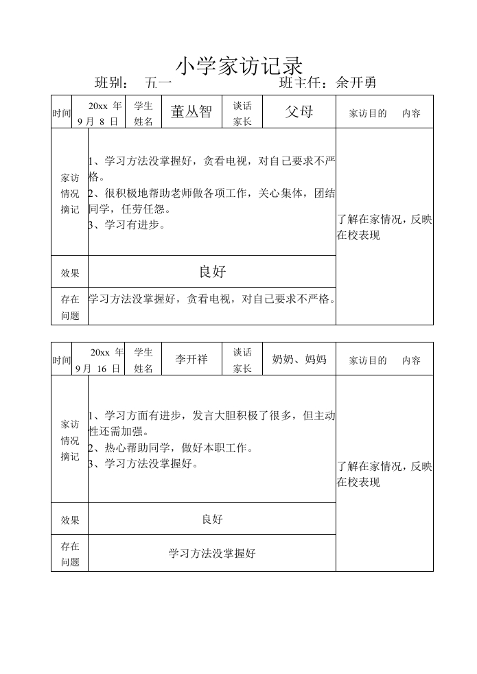 小学家访记录班别:五一主仟:余开勇20xx年学生董丛智谈话时间父母家访目的内容9月8日姓名家长、学习方法没掌握好,贪看电视,对自己要求不严家访格。情况上、很积极地帮助老师做各项工作,关心集体,团结摘记同学,任劳任怨。B、学习有进步。了解在家情况,反映在校表现效果良好存在学习方法没掌握好,贪看电视,对自己要求不严格。问题20xx年学生李开祥谈话时间奶奶、妈妈家访目的内容9月16日姓名家长1、学习方面有进步,发言大胆积极了很多,但主动家访性还需加强。情况、热心帮助同学,做好本职工作。摘记B、学习方法没掌握好。了解在家情况,反映在校表现效果良好存在学习方法没掌握好问题