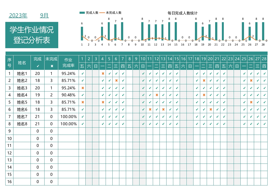 2023年9且■完成人数一未完成人数每日完成人数统计88学生作业情况登记分析表iil liil tiill bjl910111213141516171819202122232425262728序完成未完成作业134568910111213141516171819202122232425262728姓名+完成率五六日四五六日三四五六日三四五六日三四1姓名12095.24%2姓名218385.71%3姓名320195.24%4姓名419290.48%5姓名518385.71%6姓名618385.71%7姓名7210100.00%8姓名8210100.00%9001000110012001300140015001600