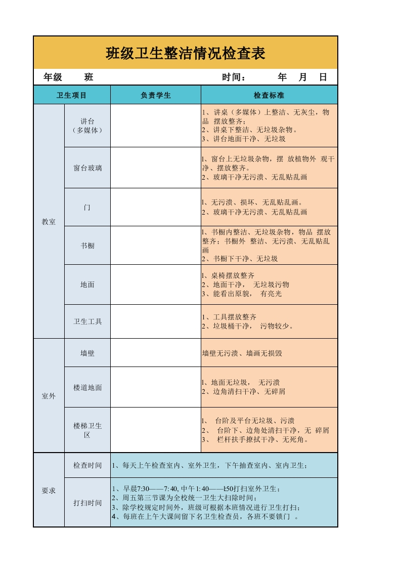 班级卫生整洁情况检查表年级班时间:年月日卫生项目负责学生检查标准1、讲桌(多媒体)上整洁、无灰尘,物讲台品摆放整齐:(多媒体)2、讲桌下整洁、无垃圾杂物。3、讲台地面干净、无垃圾1、窗台上无垃圾杂物,摆放植物外观干窗台玻璃净、摆放整齐。2、玻璃干净无污溃、无乱贴乱画、无污溃、损坏、无乱贴乱画。门2、玻璃干净无污溃、无乱贴乱画教室、书橱内整洁、无垃圾杂物,物品摆放书橱整齐:书橱外整洁、无污溃、无乱贴乱画2、书橱下干净、无垃圾、桌椅摆放整齐地面2、地面干净,无垃圾污物3、能看出原貌,有亮光卫生工具1、工具摆放整齐2、垃圾桶干净,污物较少。墙壁墙壁无污溃、墙画无损毁、地面无垃圾,无污溃楼道地面室外2、边角清扫干净、无碎屑台阶及平台无垃圾、污溃楼梯卫生区2台阶下、边角处清扫干净,无碎屑栏杆扶手撩拭干净、无死角。检查时间1、每天上午检查室内、室外卫生,下午抽查室内、室内卫生:要求1、早晨730一一7:40,中午1:40一一50打扫室外卫生:2、周五第三节课为全校统一卫生大扫除时间:打扫时间3、除学校规定时间外,班级可根据本班情况进行卫生打扫:4、每班在上午大课间留下名卫生检查员,各班不要锁门。