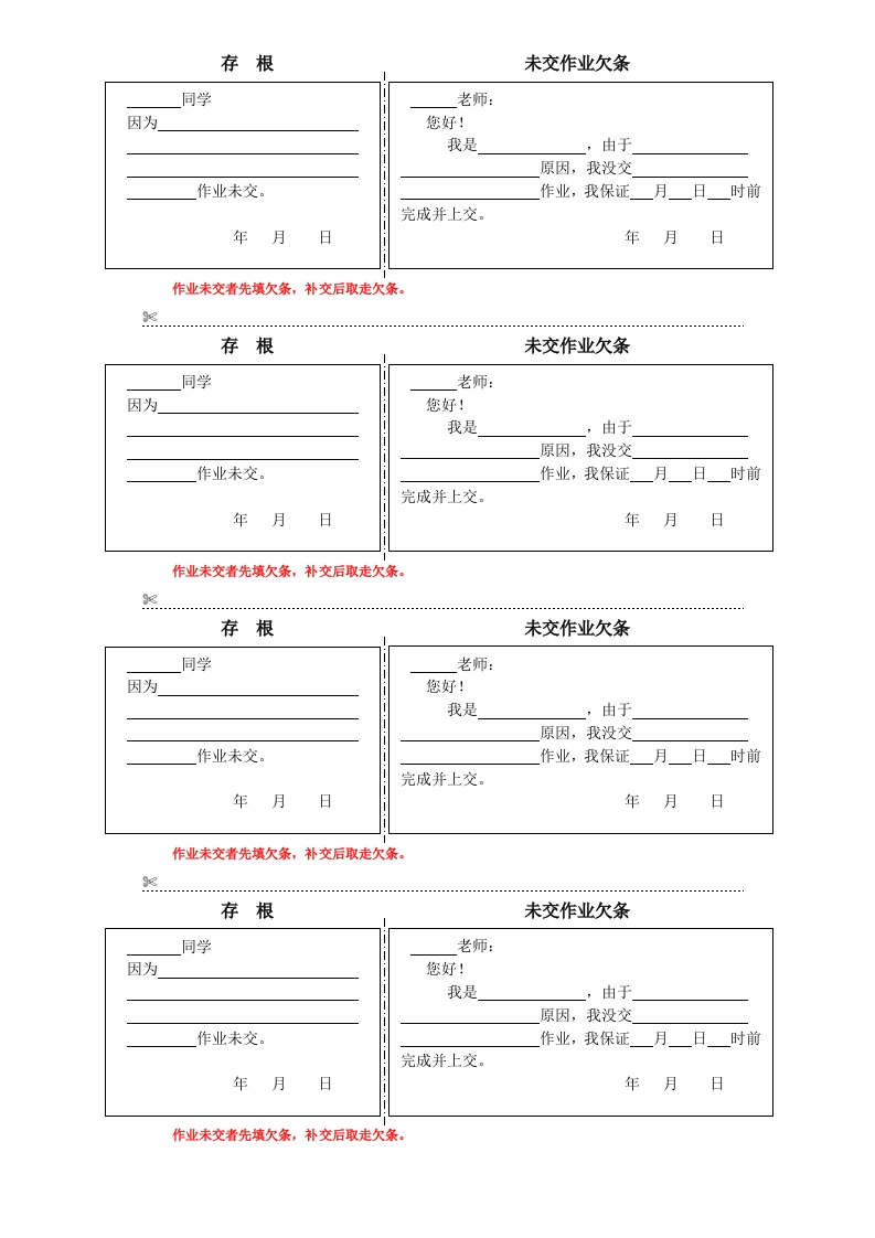存根未交作业欠条同学老师:因为您好!我是,由于原因,我没交作业未交。作业,我保证月日时前完成并上交。年月日年月日作业未交者先填欠条,补交后取走欠条。e存根未交作业欠条同学老师:因为您好!我是,由于原因,我没交作业未交。作业,我保证月日时前完成并上交年月日年月日作业未交者先填欠条,补交后取走欠条。2222.2。------。。22存根未交作业欠条同学老师:因为您好!我是,由于原因,我没交作业未交。作业,我保证月日时前完成并上交年月日年月日作业未交者先填欠条,补交后取走欠条。存根未交作业欠条同学老师:因为您好!我是,由于原因,我没交作业未交。作业,我保证月日时前完成并上交。年月日年月日作业未交者先填欠条,补交后取走欠条。