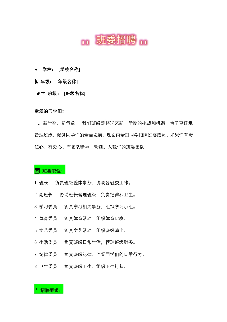 00班委招聘。学校:[学校名称]8年级:[年级名称·◆班级:[班级名称亲爱的同学们:。新学期,新气象!我们班级即将迎来新一学期的挑战和机遇。为了更好地管理班级,促进同学们的全面发展,现面向全班同学招聘班委成员。如果你有责任心、有爱心、有团队精神,欢迎加入我们的班委团队!班委职位:1.班长-负责班级整体事务,协调各班委工作。2.副班长-协助班长管理班级,负责纪律和卫生。3.学习委员-负责学习相关事务,组织学习小组。4.体育委员-负责体育活动,组织体育比赛。5.文艺委员-负责文艺活动,组织班级演出。6.生活委员-负责班级日常生活,管理班级财务。7.纪律委员-负责班级纪律,监督同学们的日常行为。8.卫生委员-负责班级卫生,组织卫生打扫。招聘要求: