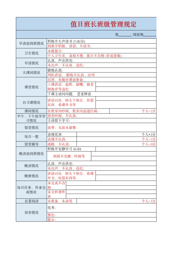 值日班长班级管理规定第周星期早读前到班情况积极并大声读书(7:00分:到班不积极、讲话、不读书:卫生情况未做值日:个人卫生差,桌椅不整,值日不合格(责成重做):早读情况认真、声音洪亮:未出声、不认真、违纪:大课间情况锻炼认真:列队讲话,锻炼不认真、出列迟到、未做好课前准备:上课讲话、起哄、插嘴,被老课堂情况师批评等违纪下课主动问问题,受老师表自习课情况讲话讨论、转头下座位、传借东西、看课外书等课间情况在教室内吵闹,教室内追逐打闹:个人-1分中午、下午放学学留堂吵闹、不认真:习情况主动留下学习:饭堂情况浪费、无故未就餐:每日一歌表现优异:个人+1分表现不认真:个人-1分留堂辅导逃跑、不认真:个人-5分积极并安静学习(6:30)晚读前到班情况到班不安静、吵闹等晚读情况认真、声音洪亮:未出声、不认真、违纪:晚修情况讲话讨论、转头下座位、看课外书、传借东西等:未完成不合每日任务、作业完格成情况未交抄袭作业名著阅读未准备、未动笔个人-1分优秀:宿舍情况警告:提示: