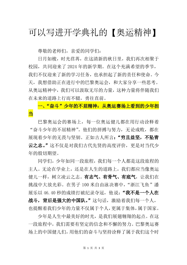 可以写进开学典礼的【奥运精神】尊敬的老师们,亲爱的同学们:日月如梭,时光荏苒,在这清新的秋日里,我们再次相聚于校园,共同迎来了2024年的新学期。在这个充满希望的季节,我们不仅迎来了新的学习任务,也承担起了新的责任和使命。今天,我想借助正在进行中的巴黎奥运会,和大家分享一些思考。从奥运精神中,我们可以汲取无尽的力量,这种力量将伴随我们在未来的道路上行而不辍,勇往直前。一、“奋斗”少年的不屈精神:从奥运赛场上看到的少年担当巴黎奥运会的赛场上,每一位奥运健儿都在用行动诠释着“奋斗少年的不屈精神”。他们的拼搏与努力,无论成败,都在展现着少年的无畏与坚韧。正如古人所言:“穷且益坚,不坠青云之志。”这不仅是对我们古代先贤的高度评价,更是对当代少年的殷切期望。同学们,少年如同一段旅程,我们每一个人都是这段旅程的主人。无论在学业上,还是在人生的道路上,我们都应当像奥运健儿一样,树立凌云之志。有志气、有骨气、有底气,让我们在挑战中大放光彩。在男子100米自由泳决赛中,“浙江飞鱼”潘展乐以46.40秒的成绩打破纪录夺冠,他说:“我不是一个人在战斗,背后是强大的中国队。”这句话,激励着我们每一个人,也提醒着我们少年的力量不仅属于个人,更属于集体,属于国家。少年是人生中最美好的时光,是我们展翅翱翔的起点。在这一段旅程中,我们需要有坚定的信念和不懈的努力。巴黎奥运赛场上的中国健儿们,用他们的奋斗与坚持诠释了属于我们这个时第1页共3页