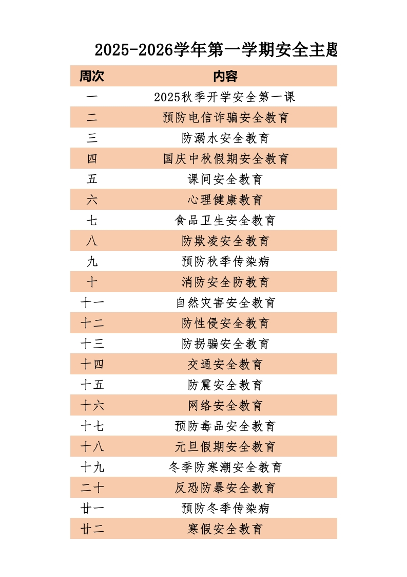 2025-2026学年第一学期安全主题周次内容2025秋季开学安全第一课二预防电信诈骗安全教育三防溺水安全教育四国庆中秋假期安全教育五课间安全教育六心理健康教育七食品卫生安全教育八防欺凌安全教育九预防秋季传染病十消防安全防教育十一自然灾害安全教育十二防性侵安全教育十三防拐骗安全教育十四交通安全教育十五防震安全教育十六网络安全教育十七预防毒品安全教育十八元旦假期安全教育十九冬季防寒潮安全教育二十反恐防暴安全教育廿一预防冬季传染病廿二寒假安全教育
