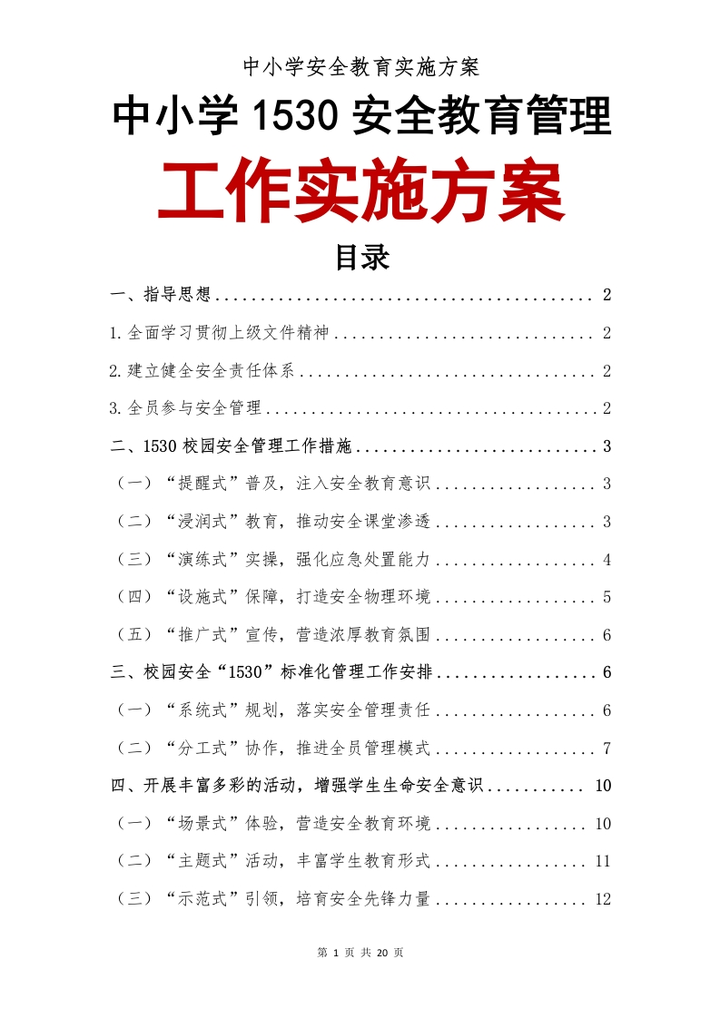 中小学安全教育实施方案中小学1530安全教育管理工作实施方案目录一、指导思想..21.全面学习贯彻上级文件精神..2.建立健全安全责任体系...a..a..23.全员参与安全管理...二、1530校园安全管理工作措施...3(一)“提醒式”普及,注入安全教育意识…3(二)“浸润式”教育,推动安全课堂渗透..·3(三)“演练式”实操,强化应急处置能力·4(四)“设施式”保障,打造安全物理环境..5(五)“推广式”宣传,营造浓厚教育氛围.…·o三、校园安全“1530”标准化管理工作安排..........6(一)“系统式”规划,落实安全管理责任.6(二)“分工式”协作,推进全员管理模式.…四、开展丰富多彩的活动,增强学生生命安全意识.·..10(一)“场景式”体验,营造安全教育环境.10(二)“主题式”活动,丰富学生教育形式·11(三)“示范式”引领,培育安全先锋力量.·12第1页共20页