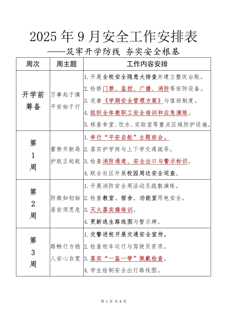 2025年9月安全工作安排表筑牢开学防线夯实安全根基周次周主题工作内容安排1.开展全校安全隐患大排查并建立整改台账。2.检修门禁、监控、广播、消防等安防设备。开学前万事起于慎3.完善《学期安全管理方案》与值班制度。筹备平安始于行4.组织全体教职工安全培训和应急演练。5.核查食堂、饮水、实验室等重点区域防护设施。1.举行“平安启航”主题班会。第蓄势开新局2.落实护学岗与上下学交通疏导。1护航正起航3.检查消防通道、安全出口与警示标识。周4.联合社区开展校园周边安全巡查。1.开展消防安全周活动及疏散演练。第防微如初始2.检查教室、宿舍、功能室用电安全。2居安须思危3.灭火器实操培训。周4.更新逃生路线图与警示牌。1.交警进校开展交通安全宣传。第3路畅行方稳2.检查校车运行与驾驶员资质。人安心自宽3.落实“一盔一带”佩戴检查。周4.学生绘制安全出行路线图。第1页共6页