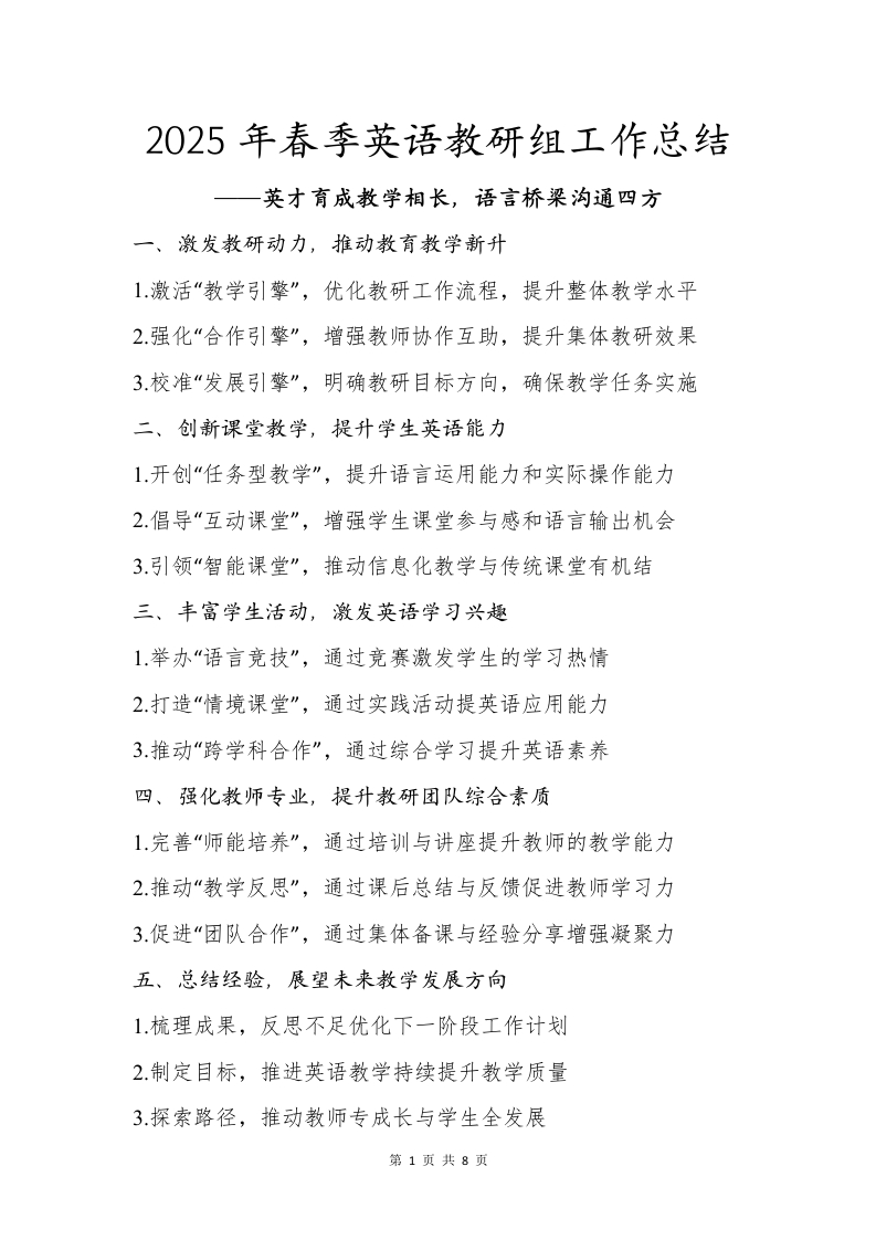 2025年春季英语教研组工作总结英才育成教学相长,语言桥梁沟通四方一、激发教研动力,推动教育教学新升1.激活“教学引擎”,优化教研工作流程,提升整体教学水平2.强化“合作引擎”,增强教师协作互助,提升集体教研效果3校准“发展引擎”,明确教研目标方向,确保教学任务实施二、创新课堂教学,提升学生英语能力1.开创“任务型教学”,提升语言运用能力和实际操作能力2倡导“互动课堂”,增强学生课堂参与感和语言输出机会3.引领“智能课堂”,推动信息化教学与传统课堂有机结三、丰富学生活动,激发英语学习兴趣1.举办“语言竞技”,通过竞赛激发学生的学习热情2打造“情境课堂”,通过实践活动提英语应用能力3推动“跨学科合作”,通过综合学习提升英语素养四、强化教师专业,提升教研团队综合素质1.完善“师能培养”,通过培训与讲座提升教师的教学能力2.推动“教学反思”,通过课后总结与反馈促进教师学习力3促进“团队合作”,通过集体备课与经验分享增强凝聚力五、总结经验,展望未来教学发展方向1.梳理成果,反思不足优化下一阶段工作计划2.制定目标,推进英语教学持续提升教学质量3.探索路径,推动教师专成长与学生全发展第1页共8页